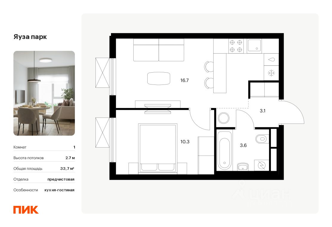 Продаётся 1-комн. квартира площадью 33,7 кв.м на 12 этаже 24 этажного дома (Корпус 10, Секция 1) проекта ПИК Яуза парк. Светлый просторный подъезд на уровне земли, функциональная планировка, большие окна, предчистовая отделка.