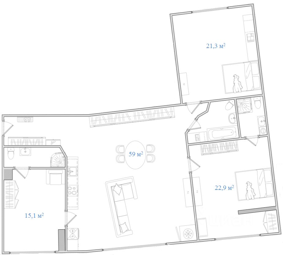 3 изолированные комнаты: 23+21,3+15,1 м2