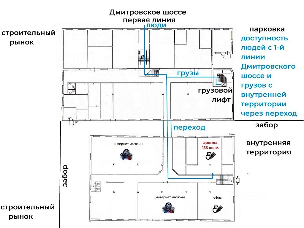 Помещение свободного назначения, офис, торговое 152 кв. м. на Дмитровском шоссе аренда. Отдельно-стоящее здание рядом с автомагистралью, 2-й этаж, потолки 3 м., грузовой лифт, хороший ремонт, проводка, кондиционеры, буфет. Возможен доступ посетителей с 1-й линии и доставка грузов подъемником. Бесплатная большая парковка, бесплатный въезд на территорию, общежитие, охрана. Рядом остановки общественного транспорта, двухуровневая развязка Дмитровского шоссе, от МКАД 5 км.