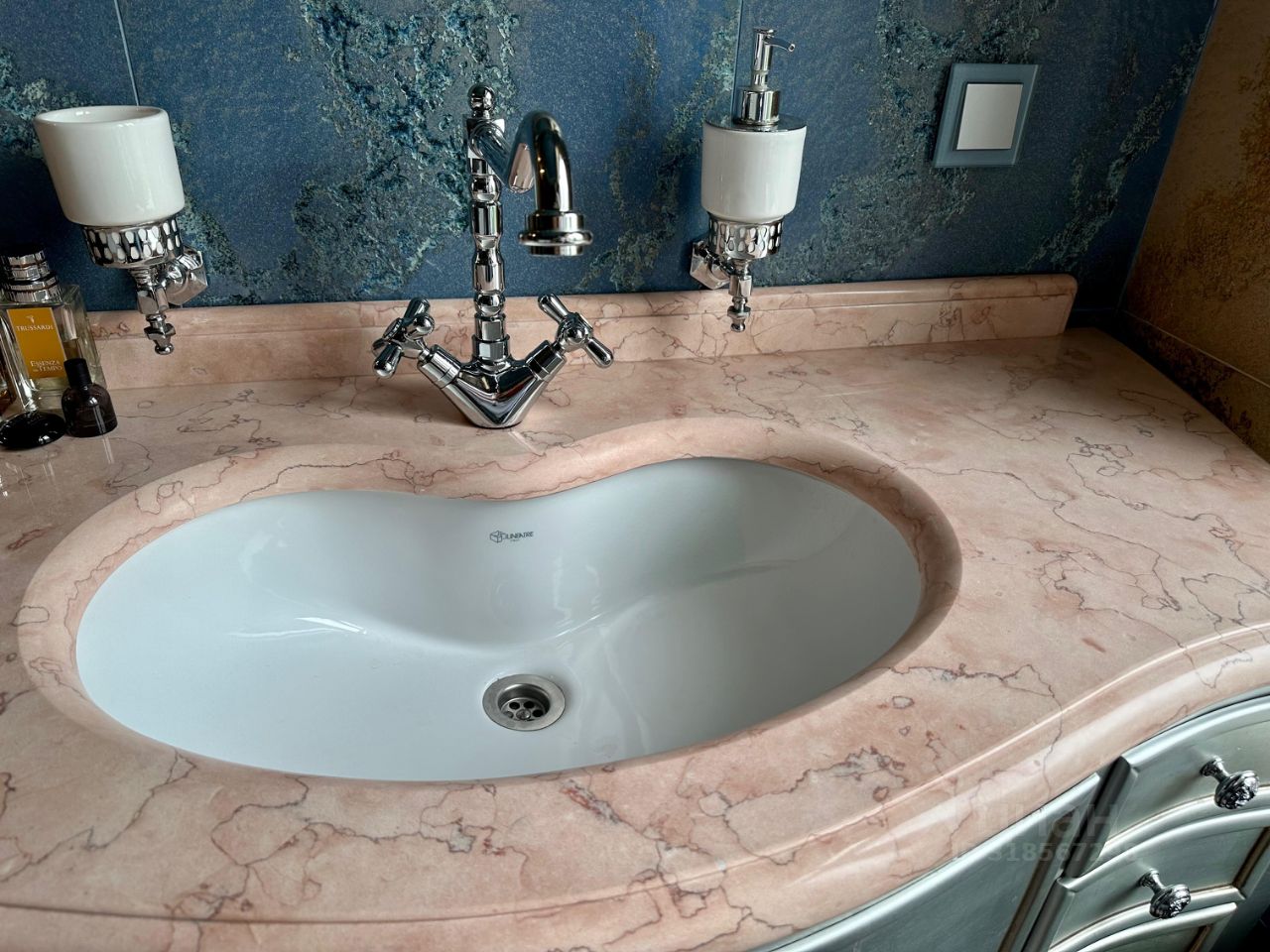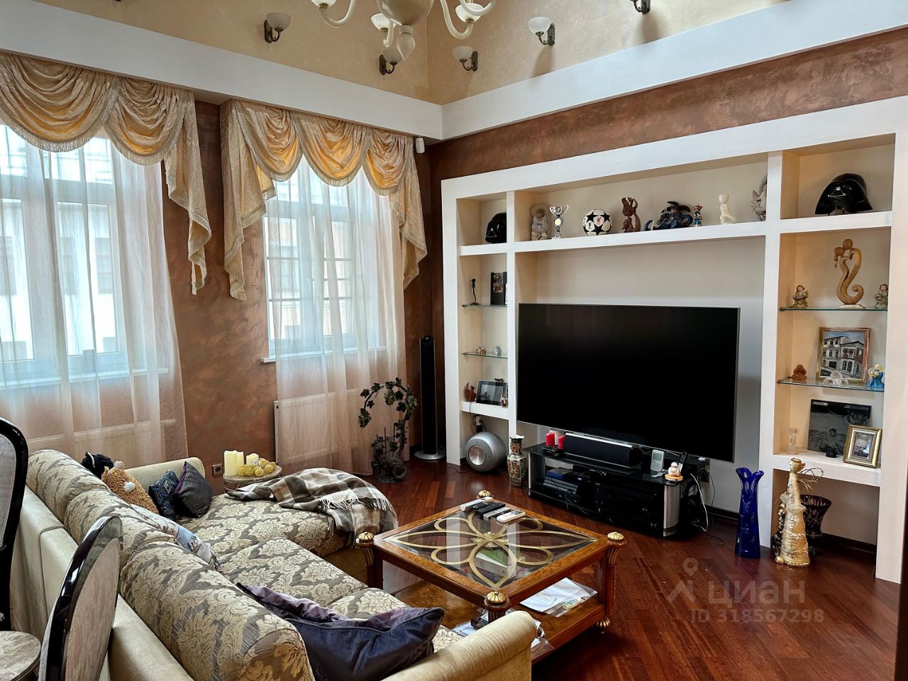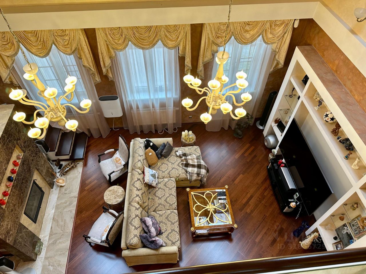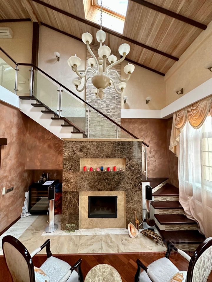 В гостиной установлен дровяной мраморный камин и комфортабельный диван, топовая акустическая система Воwеrs&Wilkins и ТВ Siеmеns 75