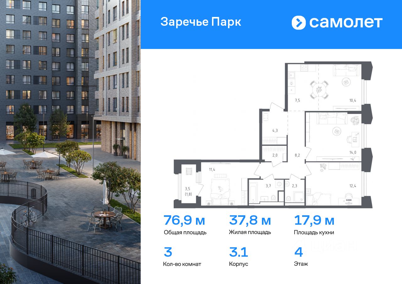 Предлагается 3-комнатная квартира бизнес-класса 76,9 кв.м в корпусе 3.1 на 4 этаже, в ЖК ''Заречье Парк'' Квартира с чистовой отделкой. Доступность дополнительных опций уточняйте у застройщика.
