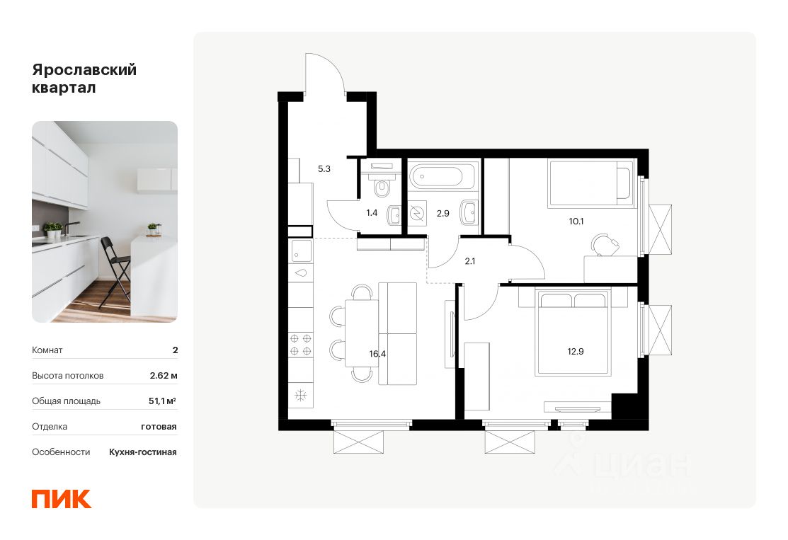 Общая площадь51,1 м2