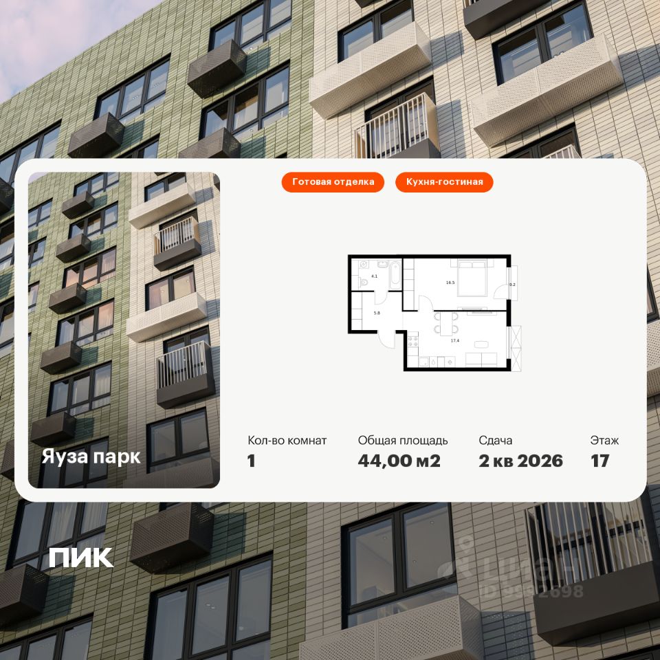 Продаётся 1-комн. квартира площадью 44 кв.м на 17 этаже 24 этажного дома (Корпус 5, Секция 1) проекта ПИК Яуза парк. Светлый просторный подъезд на уровне земли, функциональная планировка, большие окна, c отделкой.