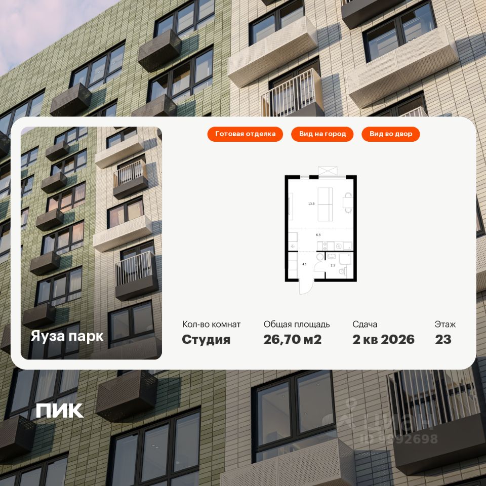 Продаётся квартира-студия площадью 26,7 кв.м на 23 этаже 24 этажного дома (Корпус 5, Секция 1) проекта ПИК Яуза парк. Светлый просторный подъезд на уровне земли, функциональная планировка, большие окна, c отделкой.