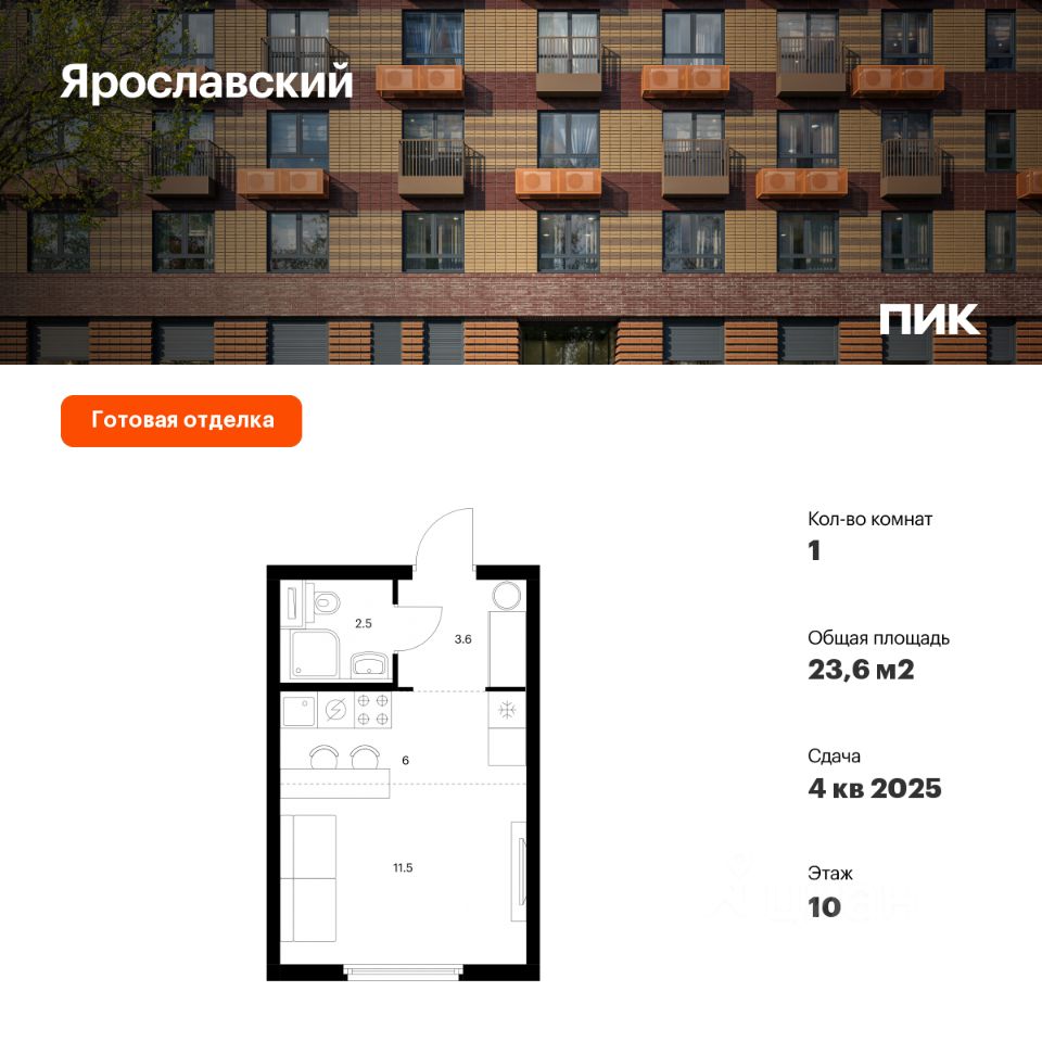 Продаётся квартира-студия площадью 23,6 кв.м на 10 этаже 25 этажного дома (Корпус 16.2, Секция 2) проекта ПИК Ярославский. Светлый просторный подъезд на уровне земли, функциональная планировка, большие окна, c отделкой.