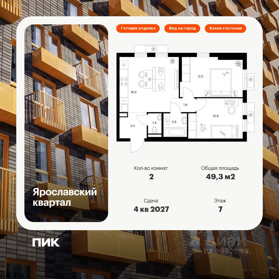 Продаётся 2-комн. квартира площадью 49,3 кв.м на 7 этаже 25 этажного дома (Корпус 2.4, Секция 1) проекта ПИК Ярославский квартал. Светлый просторный подъезд на уровне земли, функциональная планировка, большие окна, c отделкой.