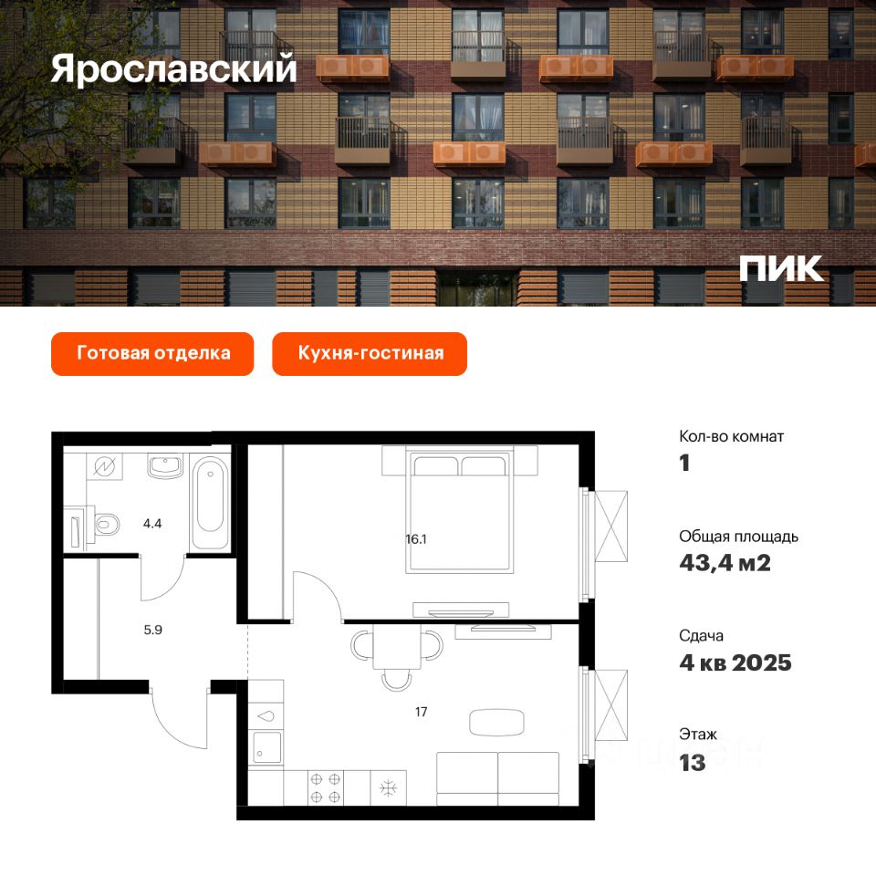 Продаётся 1-комн. квартира площадью 43,4 кв.м на 13 этаже 25 этажного дома (Корпус 16.1, Секция 1) проекта ПИК Ярославский. Светлый просторный подъезд на уровне земли, функциональная планировка, большие окна, c отделкой.