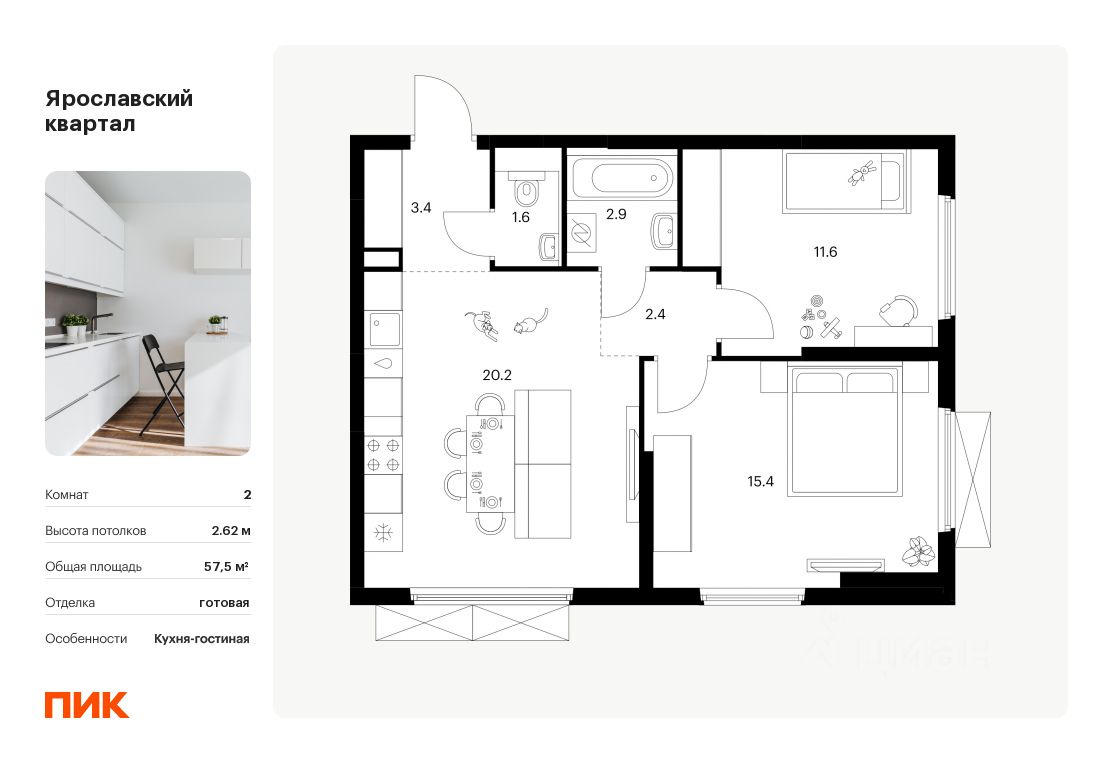 Общая площадь57,5 м2