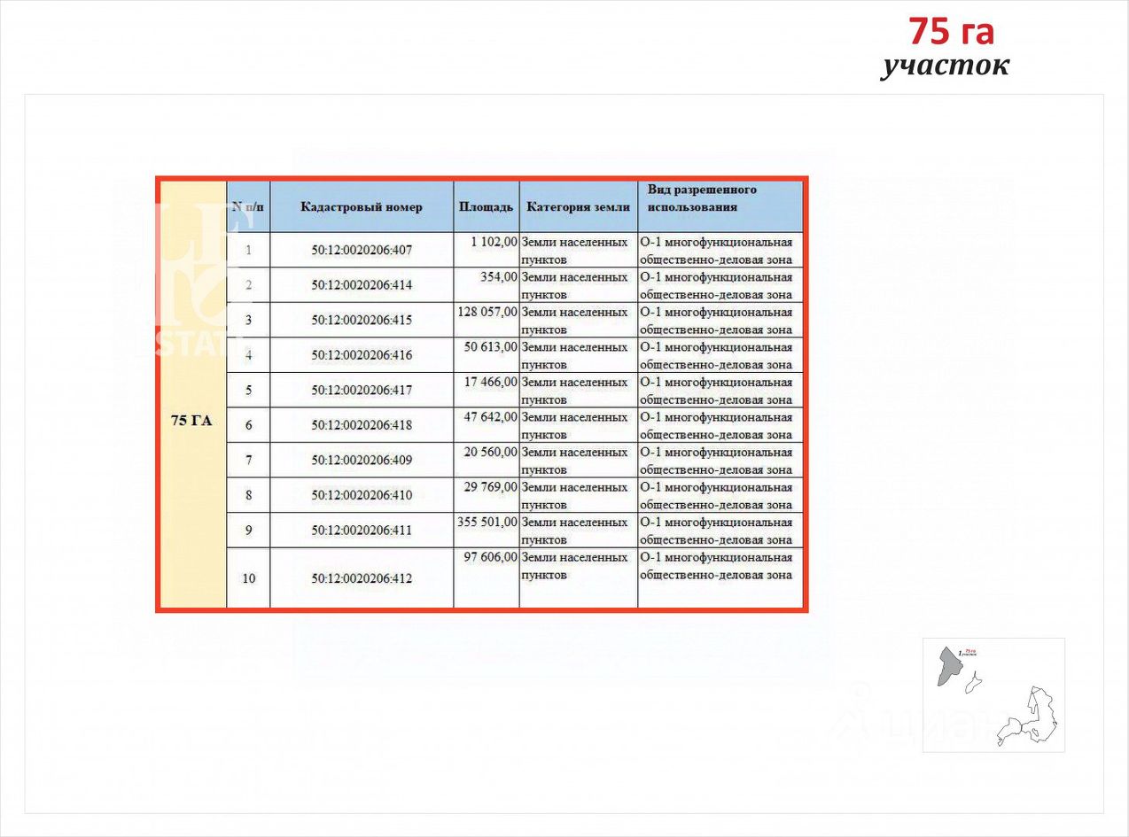 Участок состоит из десяти кадастровых номеров. Категория земель: земли населенных пунктов. Часть участок имеют вид разрешенного использования: Дошкольное, начальное. и среднее общее образование, объекты торговли, торгово-развлекательные центры, гостиничное обслуживание. Часть участков имеют вид разрешенного использования: Для сельскохозяйственной деятельности. Возможно рассмотреть участок под многоэтажное строительство при условии разработки проекта планировки и проекта межевания территории с изменением зоны на Ж-1.