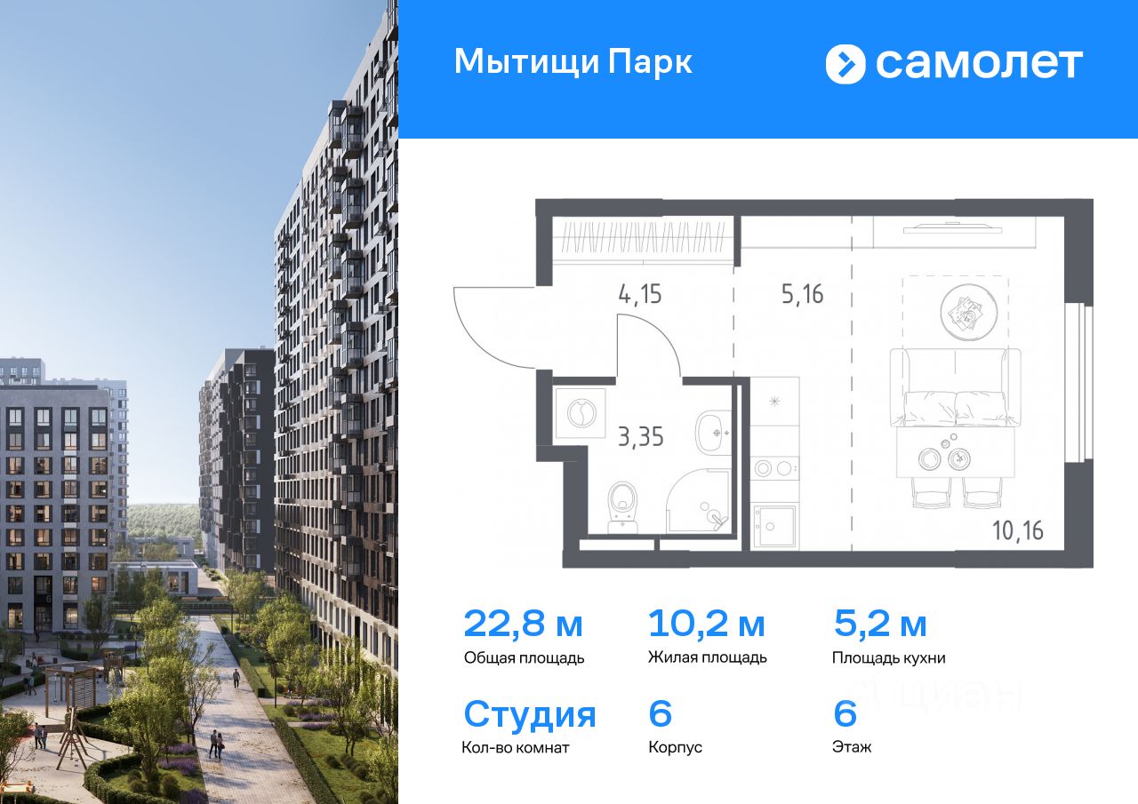 Предлагается квартира студия комфорт-класса 22,82 кв.м в корпусе 6 на 6 этаже, в ЖК ''Мытищи Парк''