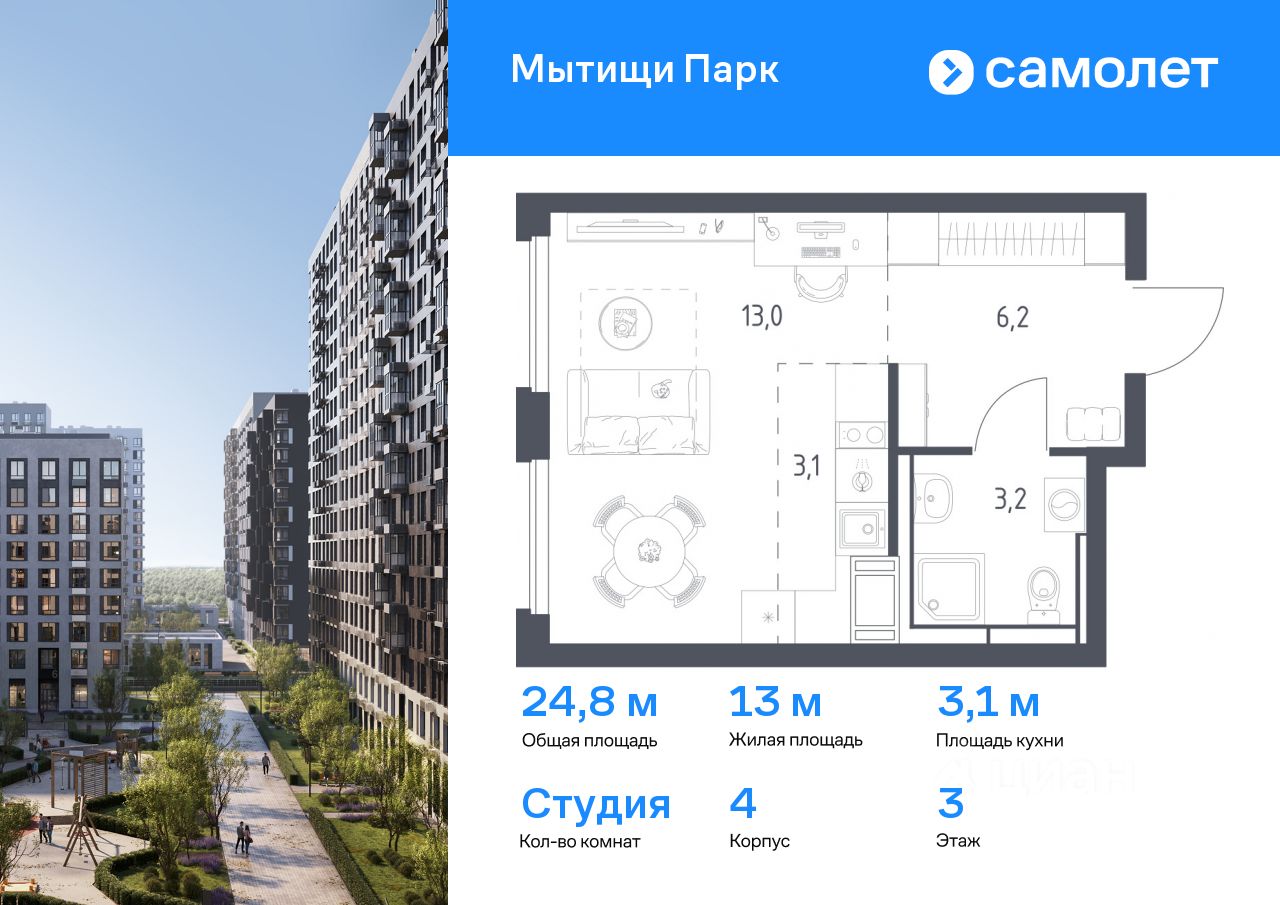 Предлагается квартира студия комфорт-класса 24,8 кв.м в корпусе 4 на 3 этаже, в ЖК ''Мытищи Парк''