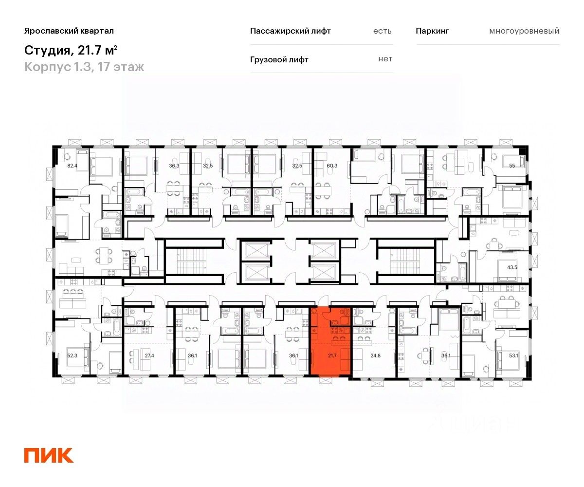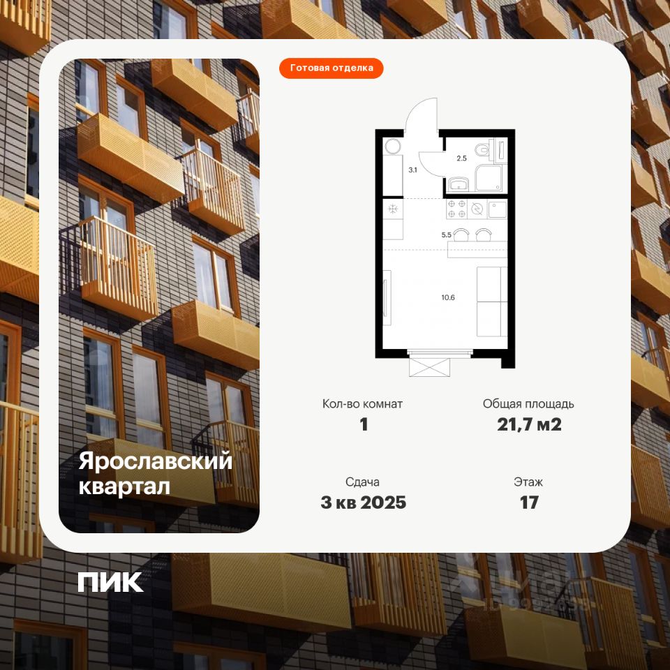 Продаётся квартира-студия площадью 21,7 кв.м на 17 этаже 24 этажного дома (Корпус 1.3, Секция 1) проекта ПИК Ярославский квартал. Светлый просторный подъезд на уровне земли, функциональная планировка, большие окна, c отделкой.