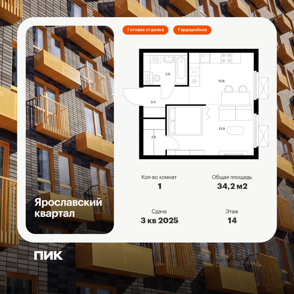 Продаётся 1-комн. квартира площадью 34,2 кв.м на 14 этаже 25 этажного дома (Корпус 1.4, Секция 1) проекта ПИК Ярославский квартал. Светлый просторный подъезд на уровне земли, функциональная планировка, большие окна, c отделкой.