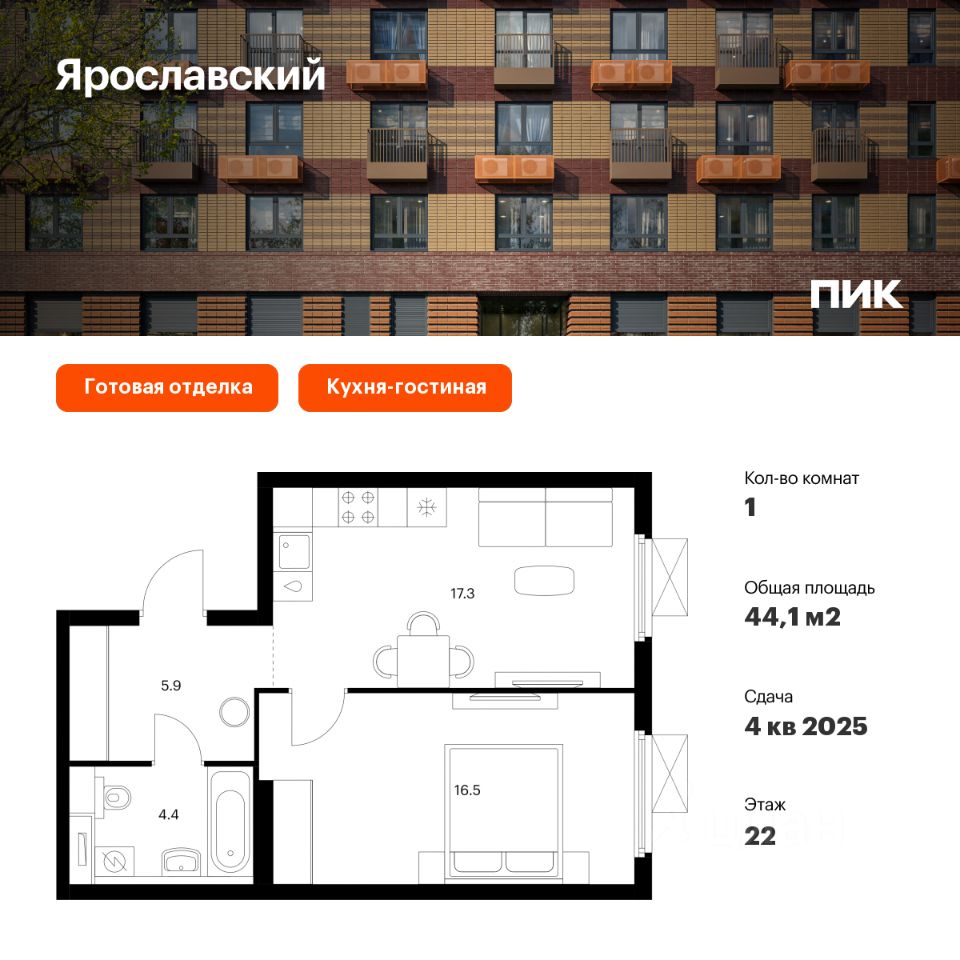 Продаётся 1-комн. квартира площадью 44,1 кв.м на 22 этаже 25 этажного дома (Корпус 16.2, Секция 2) проекта ПИК Ярославский. Светлый просторный подъезд на уровне земли, функциональная планировка, большие окна, c отделкой.
