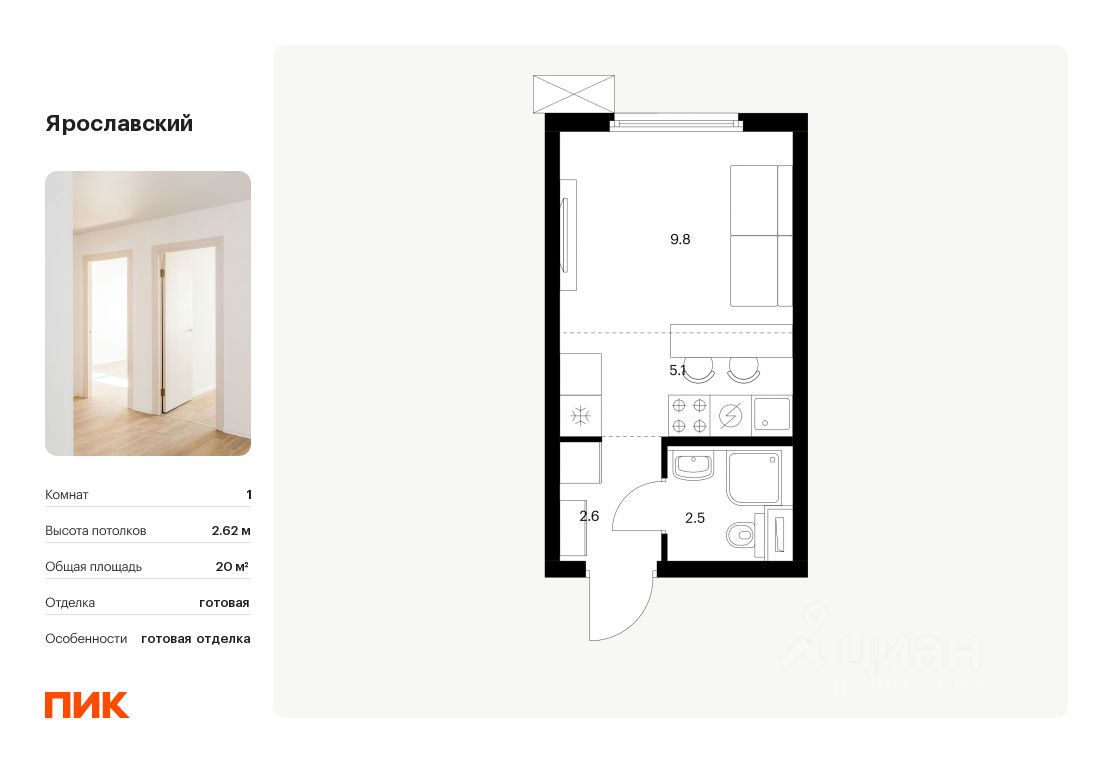 Продаётся квартира-студия площадью 20 кв.м на 23 этаже 25 этажного дома (Корпус 16.1, Секция 1) проекта ПИК Ярославский. Светлый просторный подъезд на уровне земли, функциональная планировка, большие окна, c отделкой.
