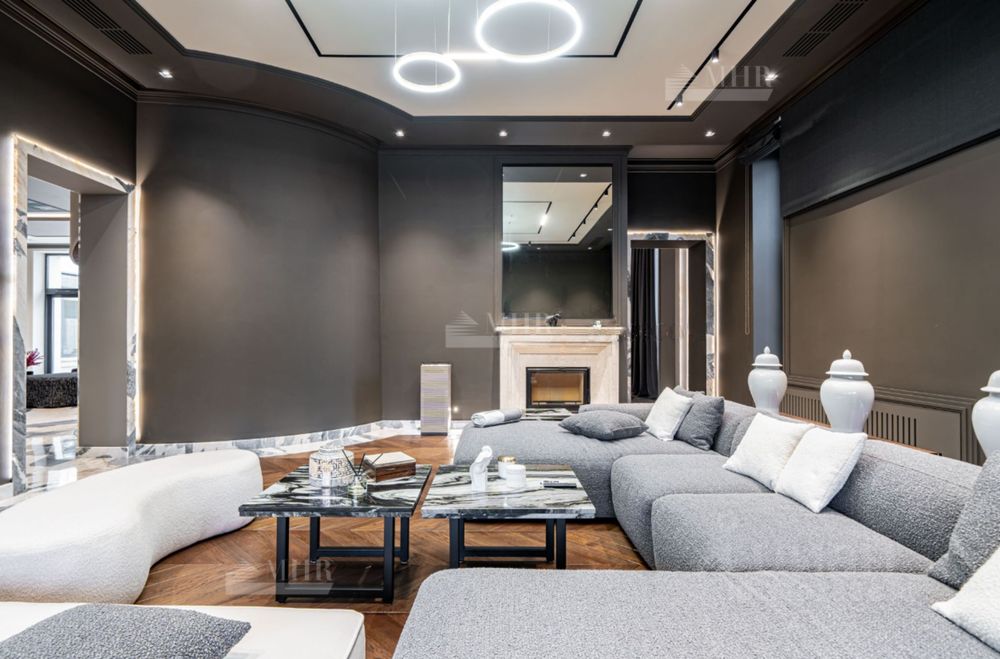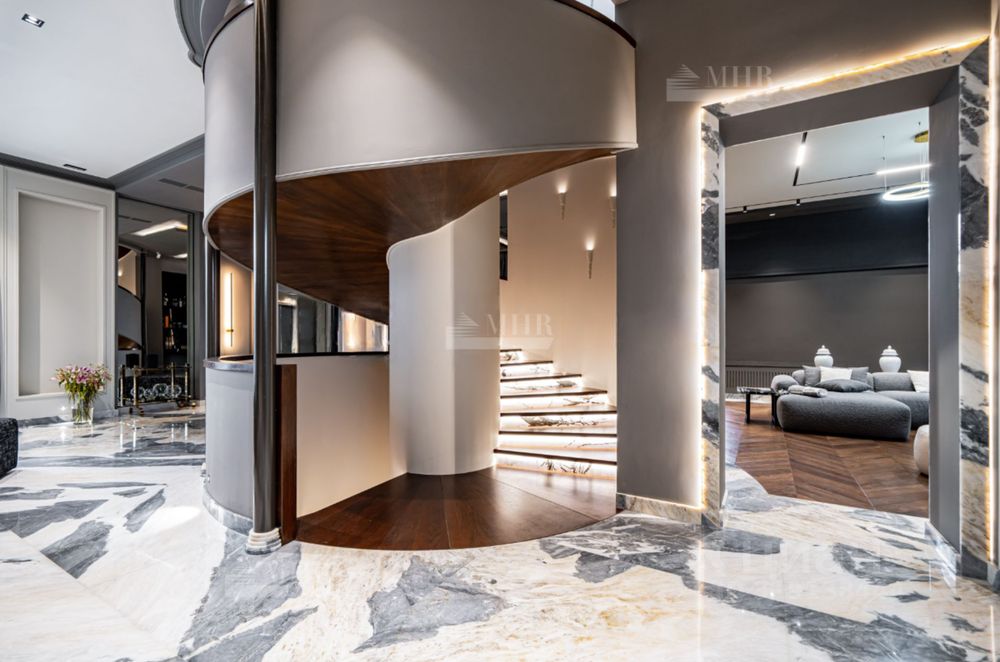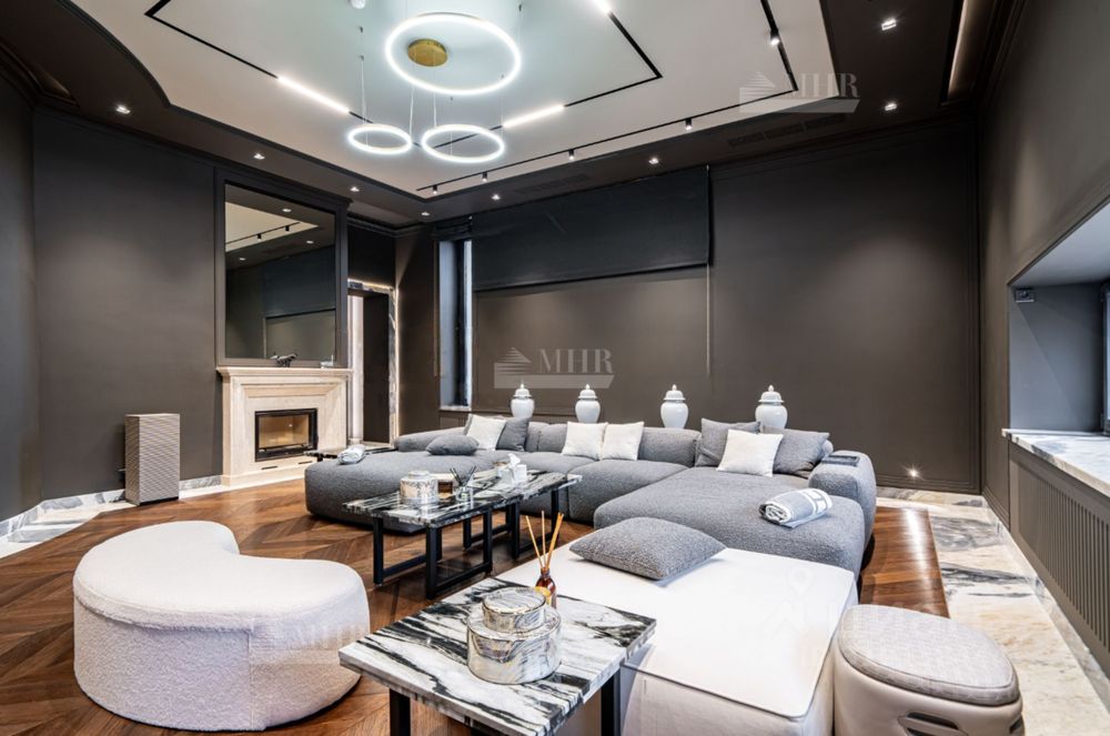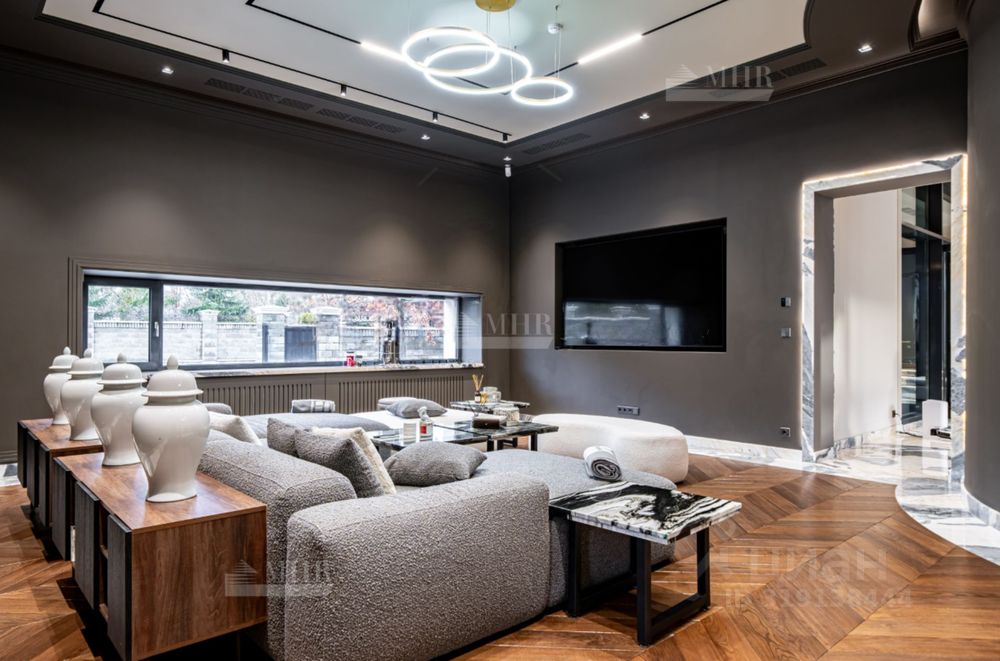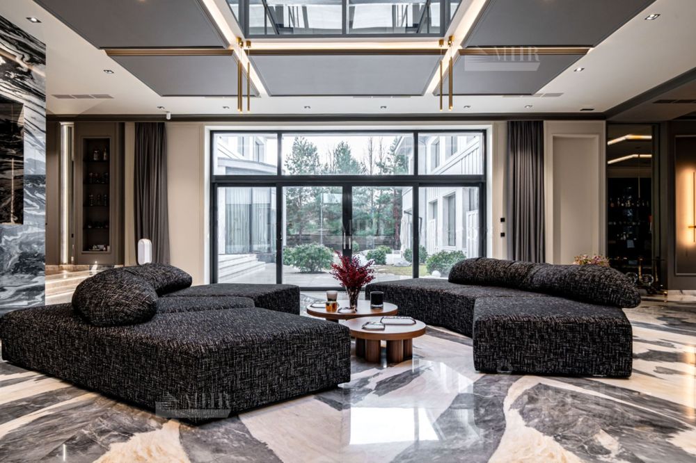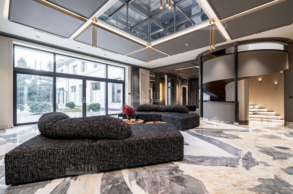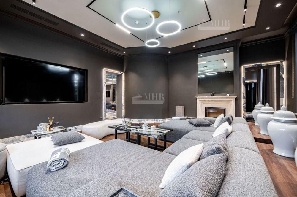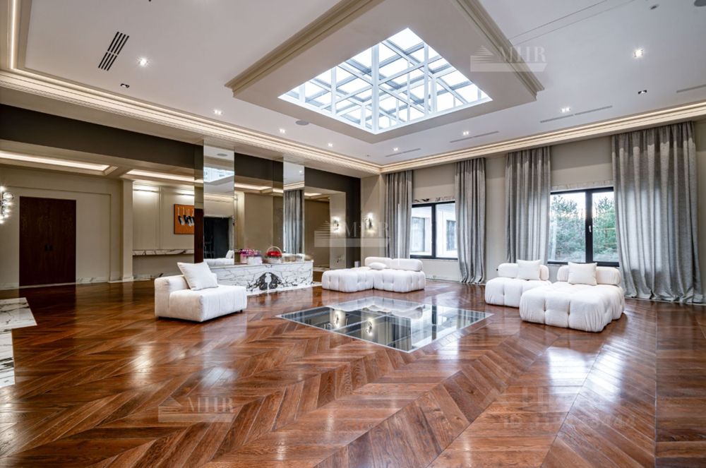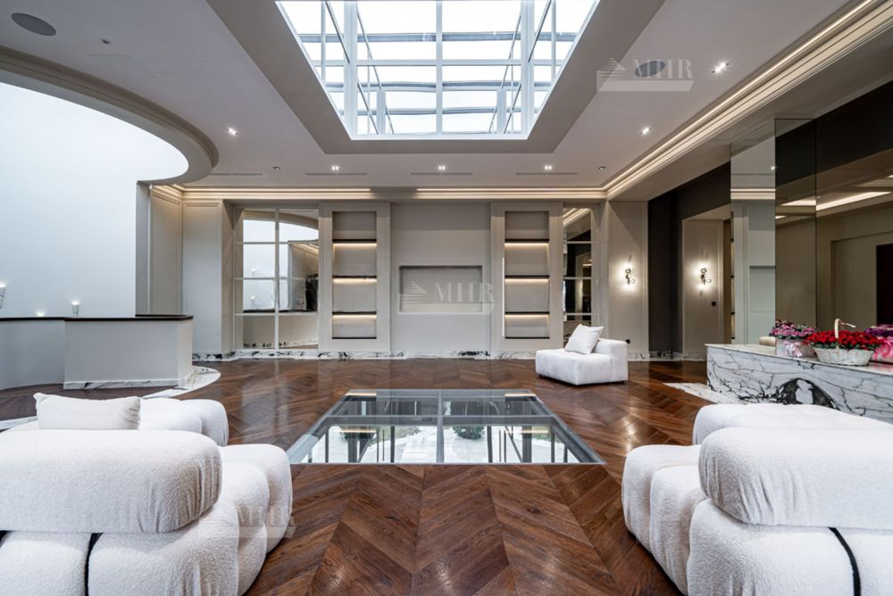 Планировка: Цоколь: кинотеатр, с\у, винный погреб, комната отдыха-курительная, рабочая кухня, 2 комнаты для персонала с с\у и гардеробными, бойлерная, 3 кладовые комнаты, большая гардеробная с шубной комнатой, гараж на 7 машин с кладовой для шин, 1й этаж: прихожая, гардеробная, с\у, холл, гостиная с двусторонним камином, столовая, кухня с выходом в рабочую кухню, комната отдыха-телевизионная, барная зона, спальня с с\у и гардеробной, вторая хозяйская спальня с с\у и гардеробной, с выходом в большую гардеробную в цоколе с массажной и шубной комнатами, будуар с выходом на террасу с фонтаном, зона СПА, бассейн с джакузи, с\у, сауна, тренажерная, душевая, выход на террасу, 2й этаж: гостиная с зоной отдыха и барной, двусторонний камин, хозяйская спальня с с\у и гардеробной, с хамамом и выходом на террасу, кабинет с выходом на террасу, лифт, комната для няни с с\у, серверная, детская спальня с с\у и гардеробной, детская спальня с с\у, игровая комната с выходом на террасу.