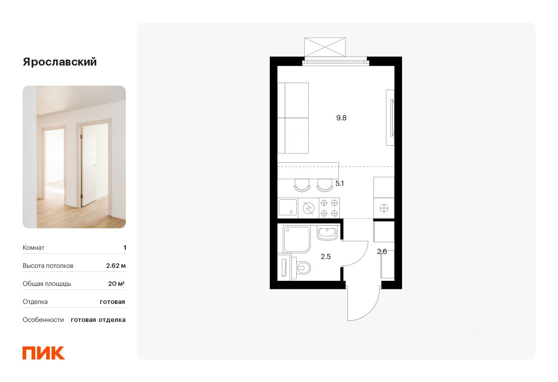 Продаётся квартира-студия площадью 20 кв.м на 11 этаже 25 этажного дома (Корпус 16.1, Секция 1) проекта ПИК Ярославский. Светлый просторный подъезд на уровне земли, функциональная планировка, большие окна, c отделкой.