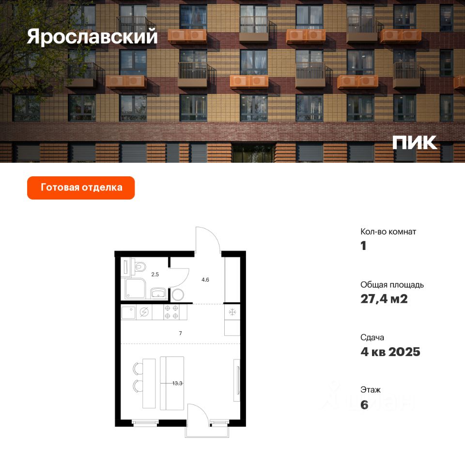 Продаётся квартира-студия площадью 27,4 кв.м на 6 этаже 25 этажного дома (Корпус 16.2, Секция 2) проекта ПИК Ярославский. Светлый просторный подъезд на уровне земли, функциональная планировка, большие окна, c отделкой.