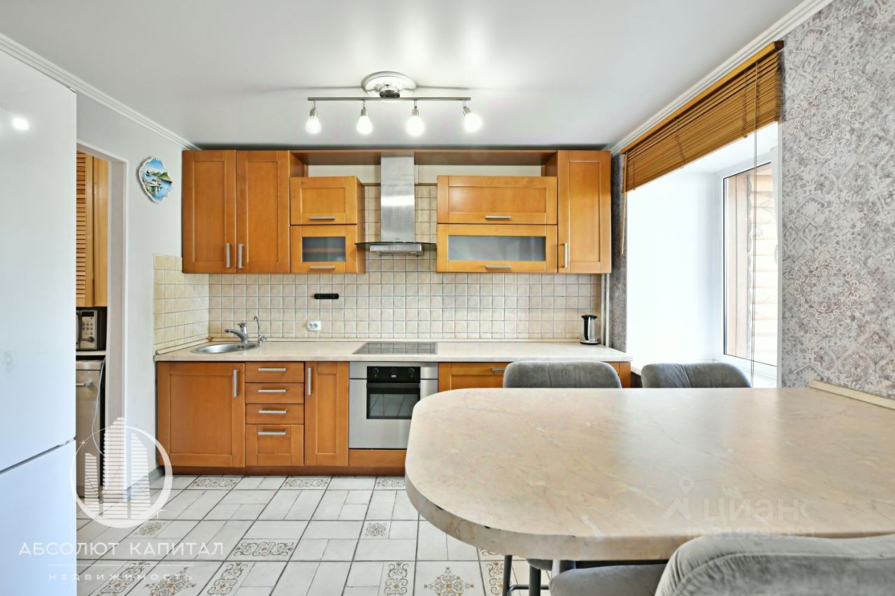 Просторная кухня точно порадует будущую хозяйку современным оборудованием: стеклокерамическая варочная панель, духовой шкаф, двухкамерный холодильник, посудомоечная машина и вместительный шкаф.