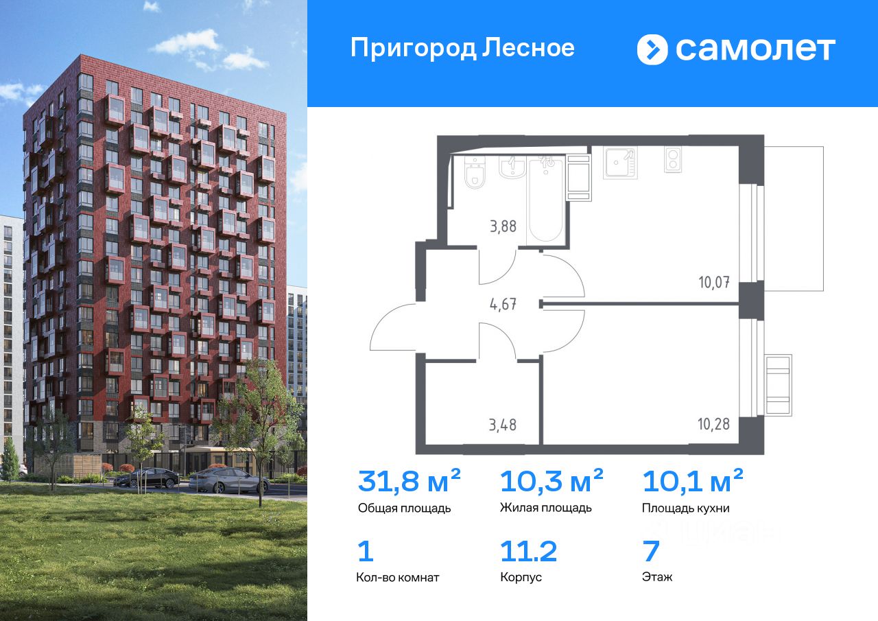 Предлагается 1-комнатная квартира комфорт-класса 31,8 кв.м в корпусе 11.2 на 7 этаже, в ЖК ''Пригород Лесное'' Квартира с чистовой отделкой. Доступность дополнительных опций уточняйте у застройщика.