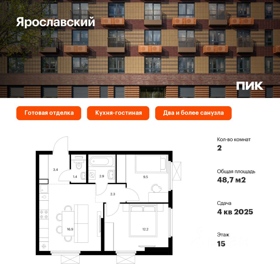 Продаётся 2-комн. квартира площадью 48,7 кв.м на 15 этаже 25 этажного дома (Корпус 16.4, Секция 4) проекта ПИК Ярославский. Светлый просторный подъезд на уровне земли, функциональная планировка, большие окна, c отделкой.