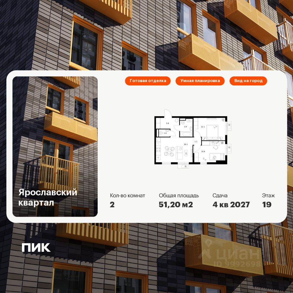 Продаётся 2-комн. квартира площадью 51,2 кв.м на 19 этаже 25 этажного дома (Корпус 2.2, Секция 1) проекта ПИК Ярославский квартал. Светлый просторный подъезд на уровне земли, функциональная планировка, большие окна, c отделкой.