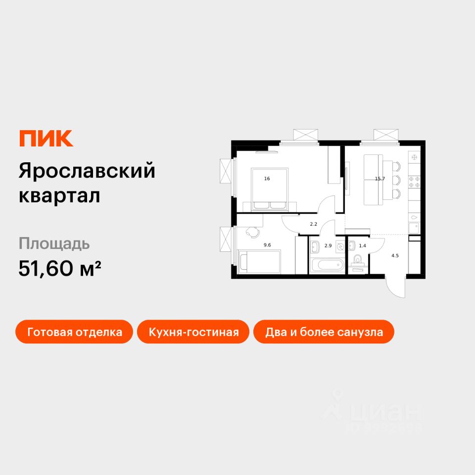 Продаётся 2-комн. квартира площадью 51,6 кв.м на 15 этаже 24 этажного дома (Корпус 1.3, Секция 1) проекта ПИК Ярославский квартал. Светлый просторный подъезд на уровне земли, функциональная планировка, большие окна, c отделкой.