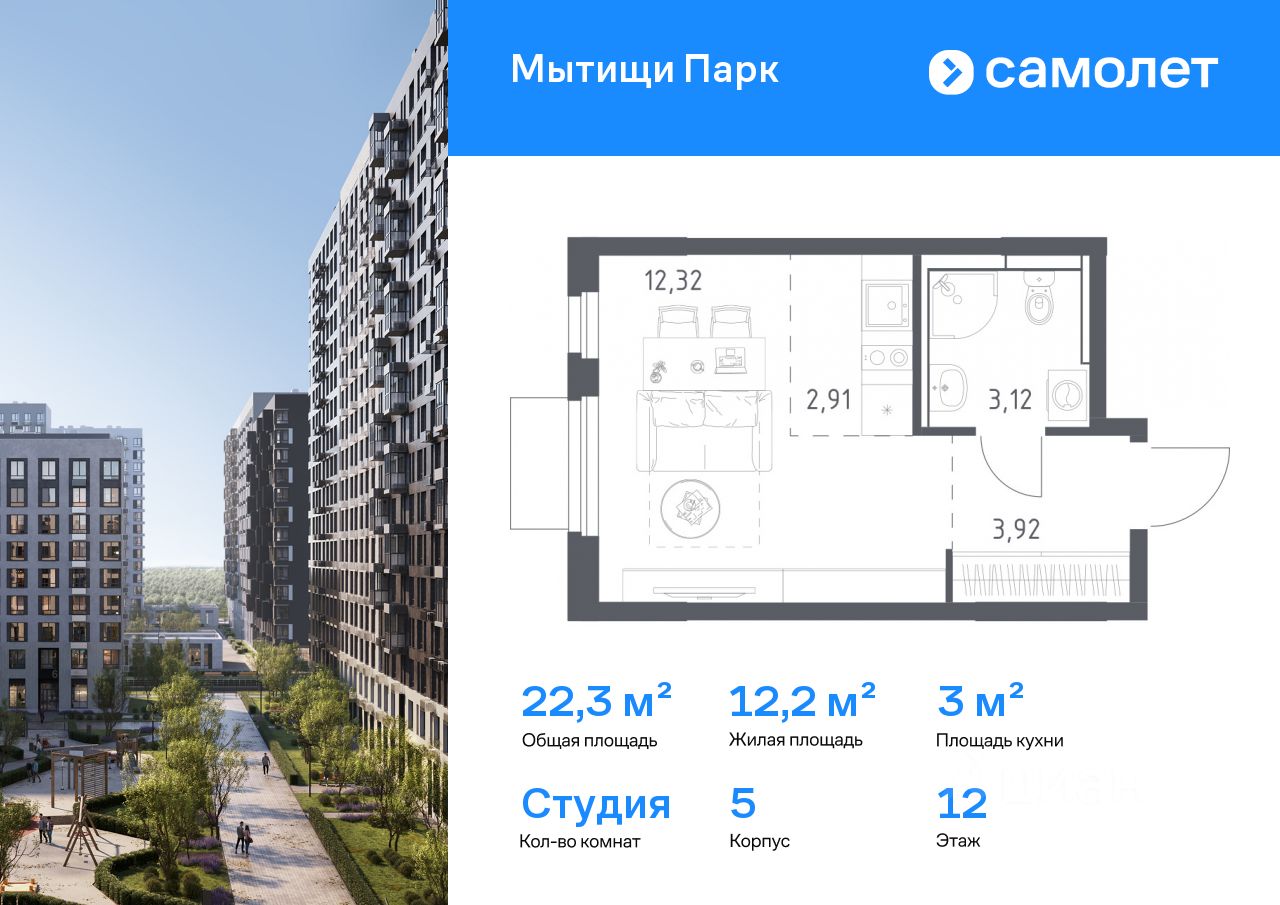 Предлагается квартира студия комфорт-класса 22,27 кв.м в корпусе 5 на 12 этаже, в ЖК ''Мытищи Парк''