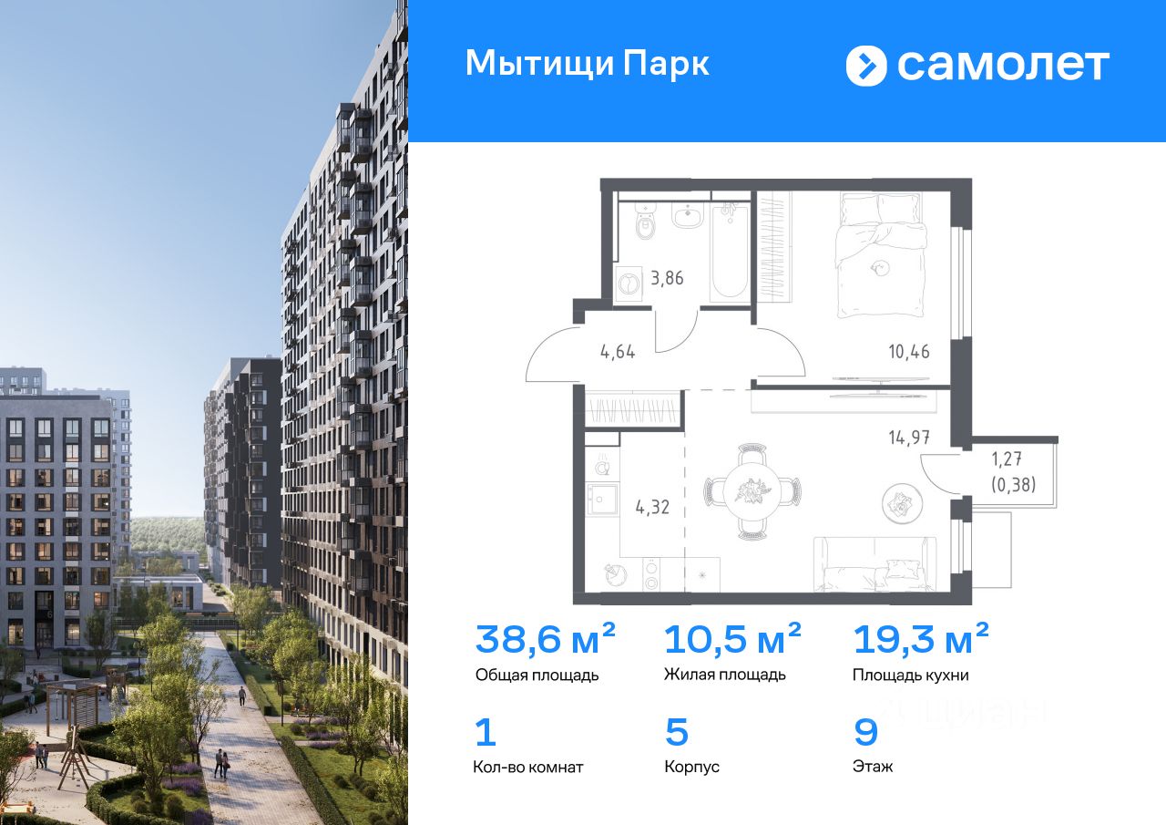 Строим кварталы для жизни с заботой о будущем. Предлагается 1-комнатная квартира комфорт-класса 38,63 кв.м в корпусе 5 на 9 этаже, в ЖК ''Мытищи Парк''