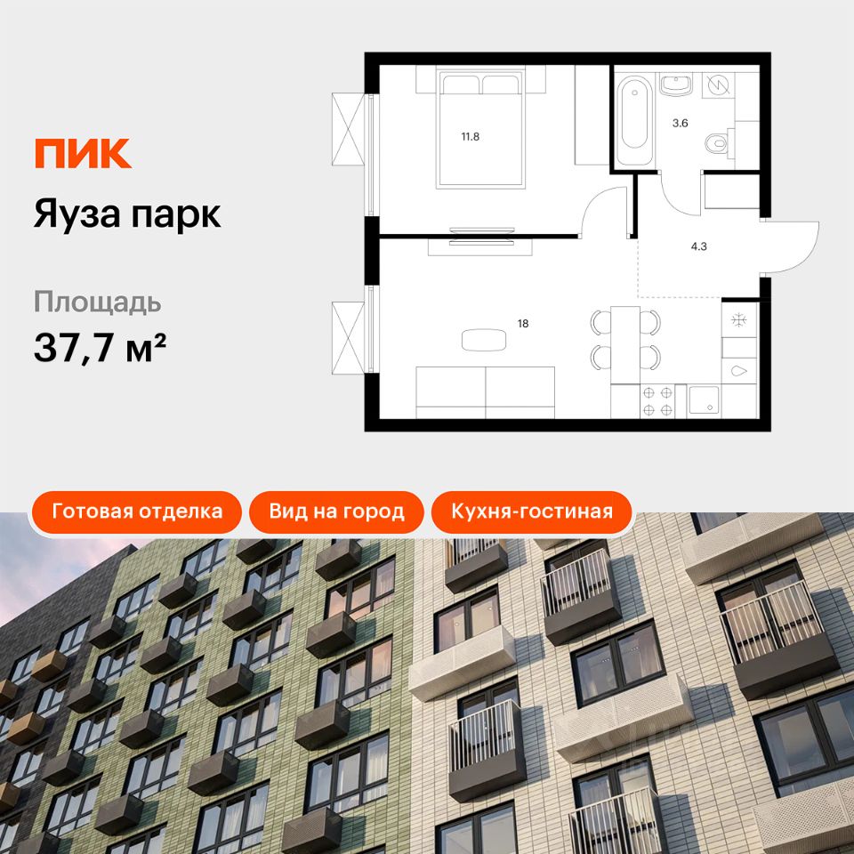 Продаётся 1-комн. квартира площадью 37,7 кв.м на 22 этаже 24 этажного дома (Корпус 5, Секция 1) проекта ПИК Яуза парк. Светлый просторный подъезд на уровне земли, функциональная планировка, большие окна, c отделкой.