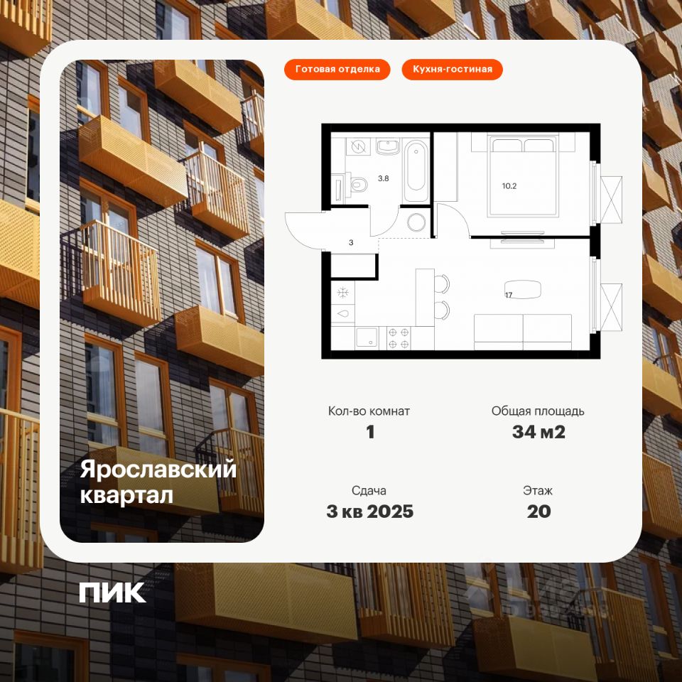 Продаётся 1-комн. квартира площадью 34 кв.м на 20 этаже 25 этажного дома (Корпус 1.2, Секция 1) проекта ПИК Ярославский квартал. Светлый просторный подъезд на уровне земли, функциональная планировка, большие окна, c отделкой.
