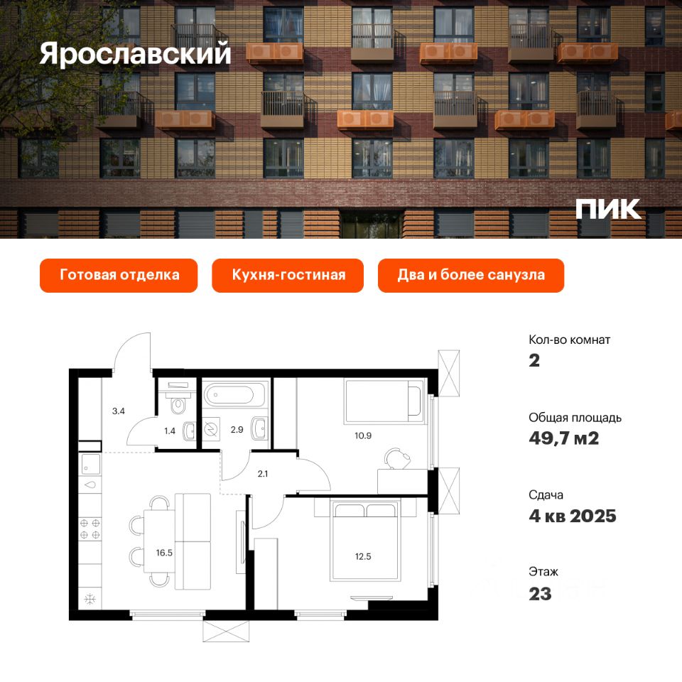 Продаётся 2-комн. квартира площадью 49,7 кв.м на 23 этаже 25 этажного дома (Корпус 16.3, Секция 3) проекта ПИК Ярославский. Светлый просторный подъезд на уровне земли, функциональная планировка, большие окна, c отделкой.