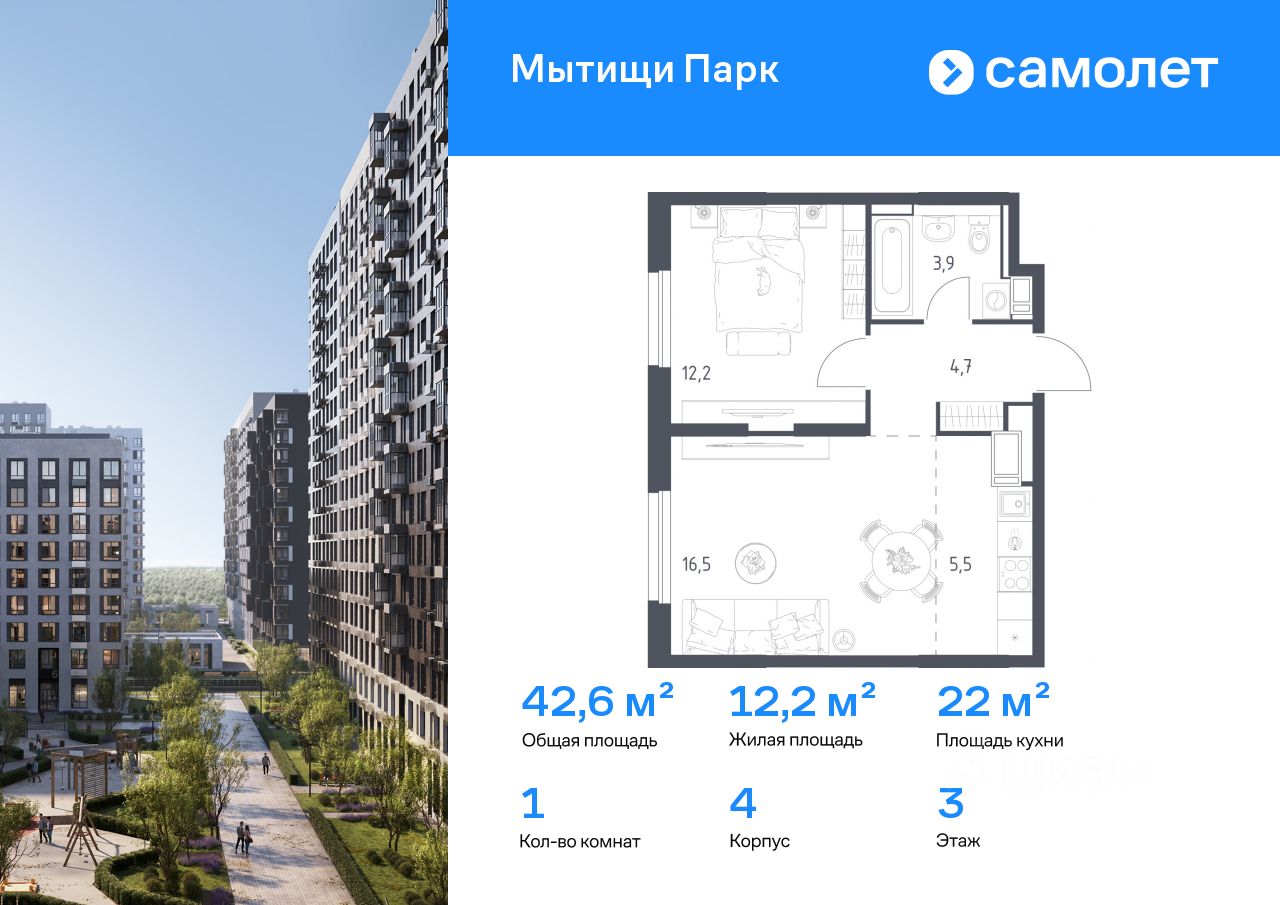 Предлагается 1-комнатная квартира комфорт-класса 42,6 кв.м в корпусе 4 на 3 этаже, в ЖК ''Мытищи Парк''