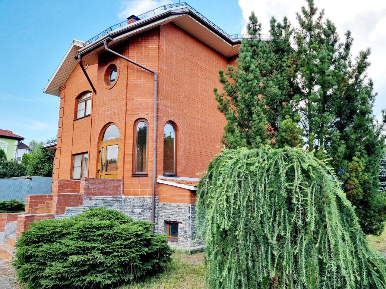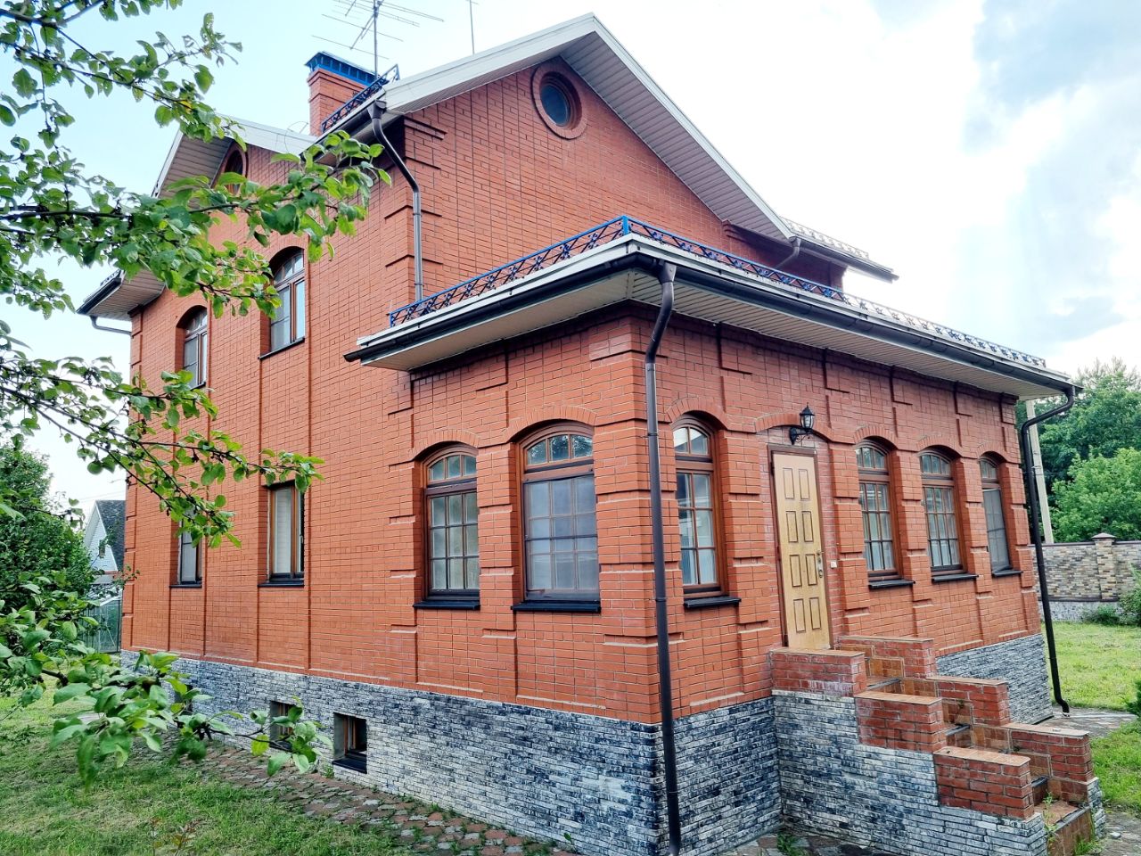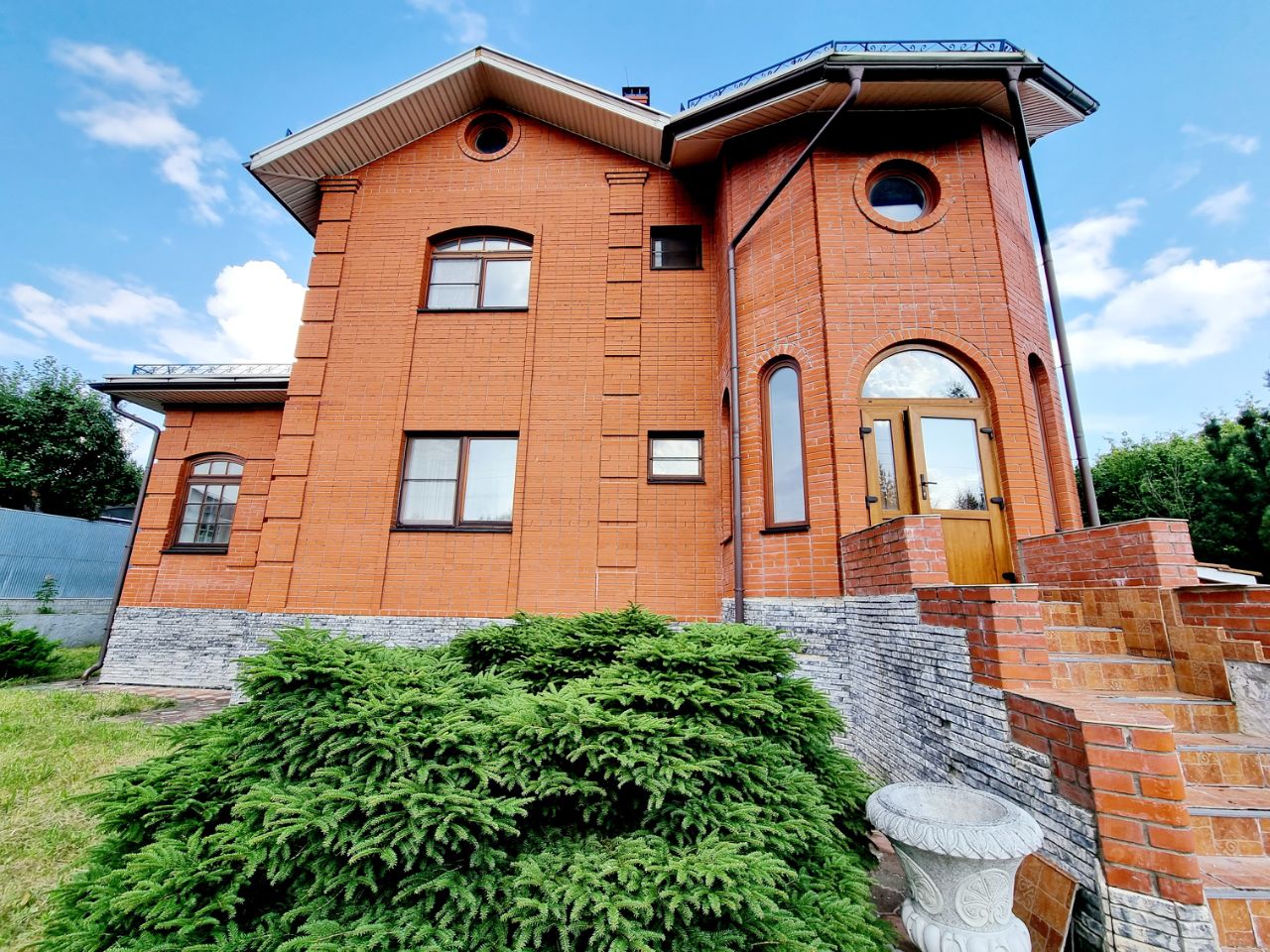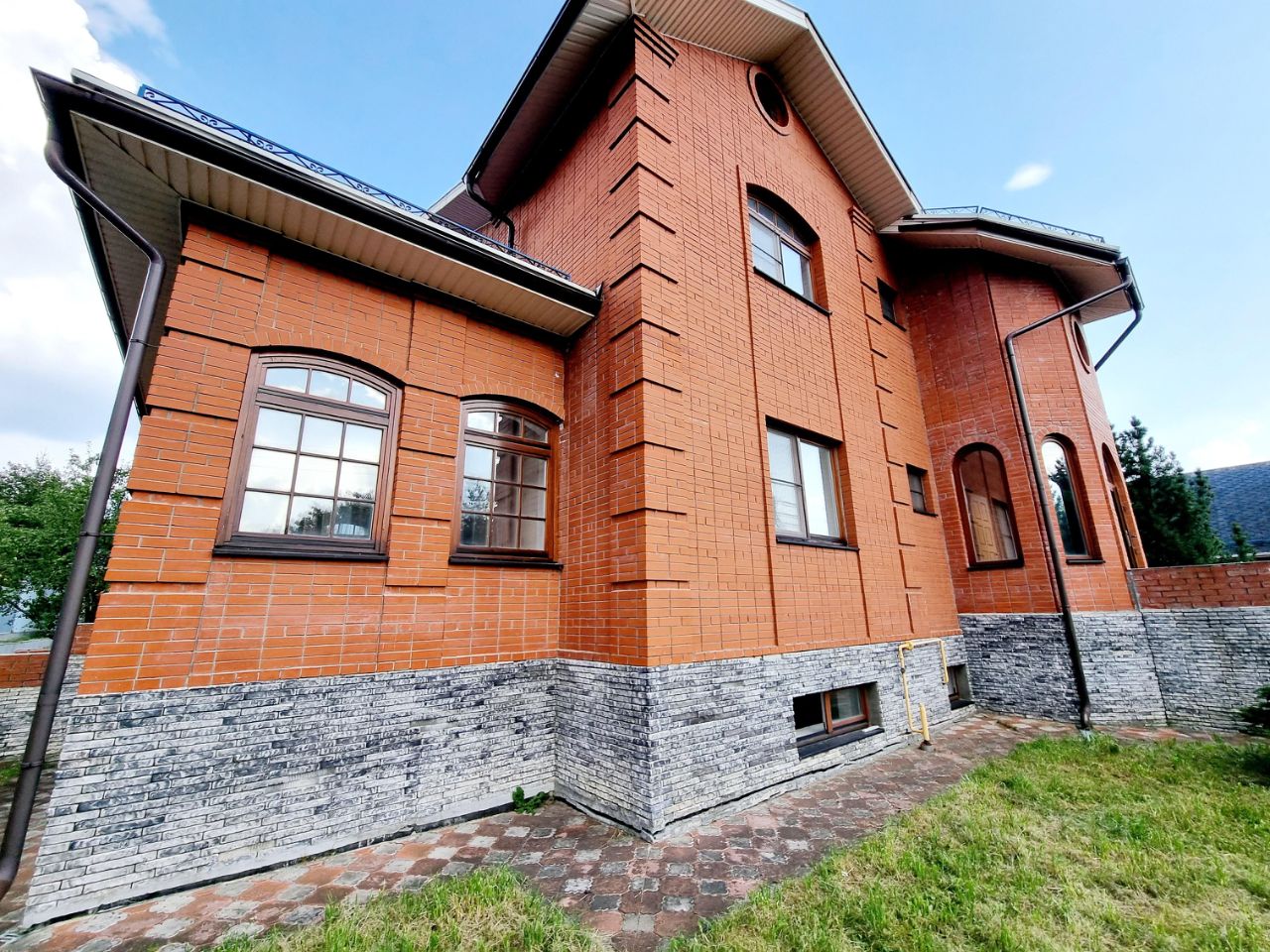 Монолитный дом из красного кирпича, который является одним из самых практичных вариантов фасадной отделки и смотрится дорого и красиво. Имеет полноценный монолитный цокольный этаж с окнами. Устойчив к воздействию климатических факторов, не подвержен разрушению вредителей, мыши, древоточцы, короеды и другие вредители не могут нанести вред камню. Может эксплуатироваться много лет без необходимости в ремонте фасада и обладает огнестойкостью.