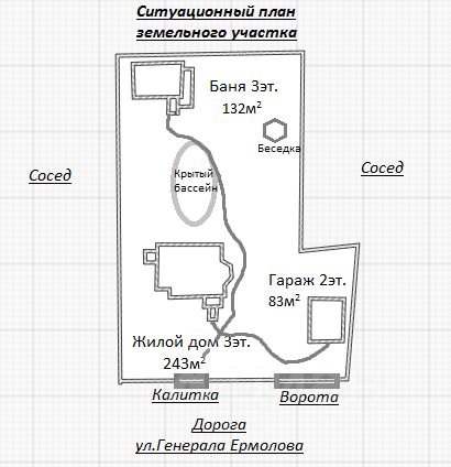 Коммуникации: электричество, газ, канализация централизованные. Два смежных участка, кадастровые номера 50:12:0040123:77, 50:12:0040123:112. На участках также расположены: баня, крытый большой бассейн и гараж с апартаментами для персонала. - баня из трех этажей с бассейном, цоколь с техническими и хозяйственными помещениями, на первом этаже комната отдыха с зоной кухни, санузел, бассейн с душевой и сауна. - бассейн крытый 25 метров в ширину 3 метра - гараж на 2-3 автомобиля с мастерской в два этажа, на втором этаже комнаты для персонала и санузел - теплица на фундаменте - беседка с зоной барбекю