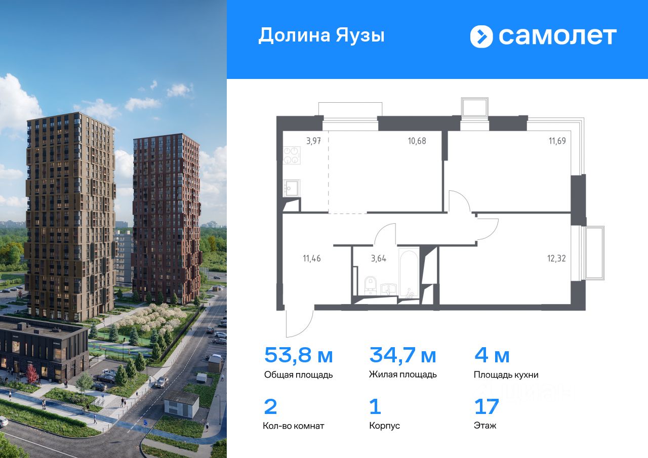 Предлагается 2-комнатная квартира комфорт-класса 53,76 кв.м в корпусе 1 на 17 этаже, в ЖК ''Долина Яузы'' Квартира с чистовой отделкой. Доступность дополнительных опций уточняйте у застройщика.