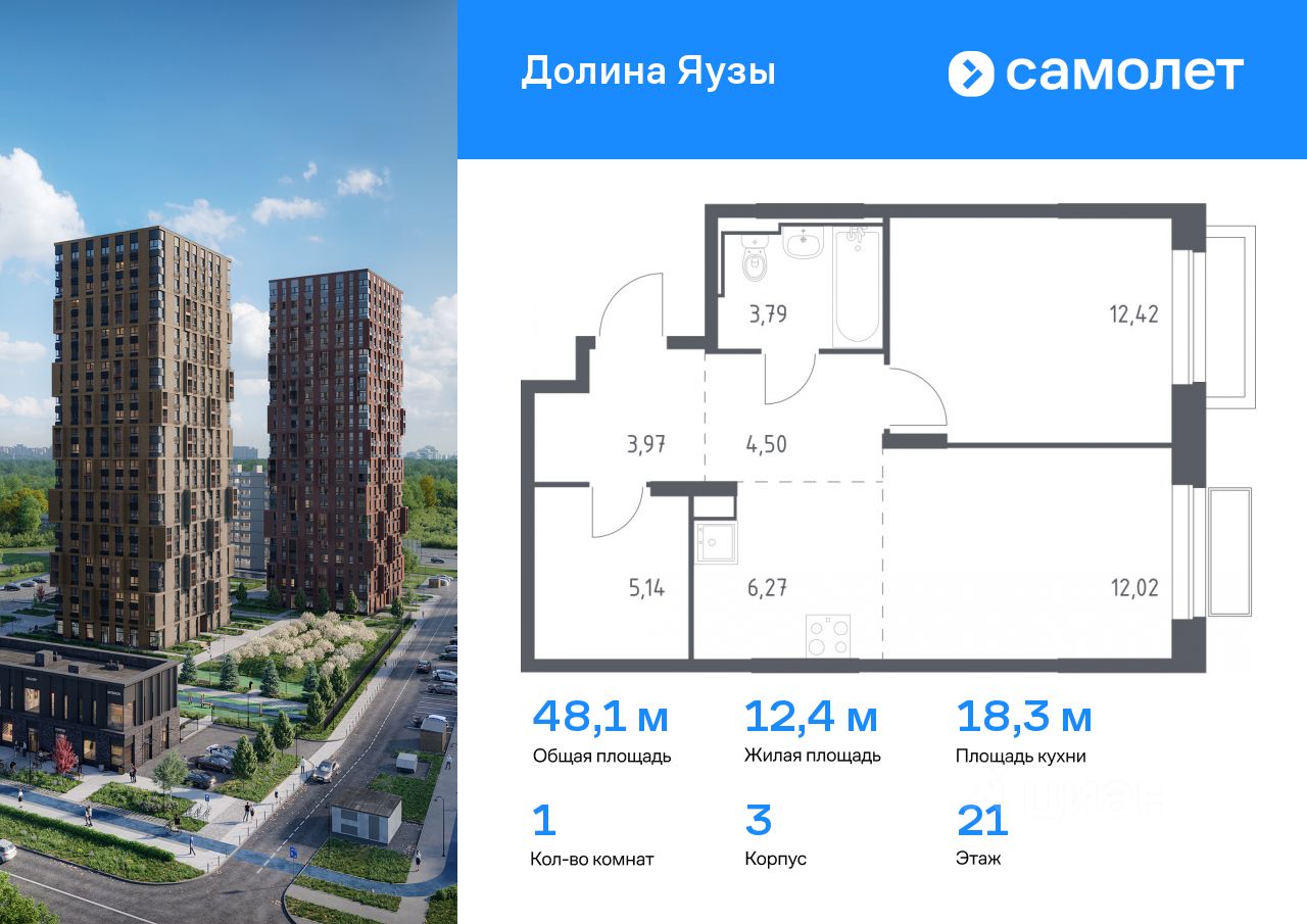 Предлагается 1-комнатная квартира комфорт-класса 48,11 кв.м в корпусе 3 на 21 этаже, в ЖК ''Долина Яузы'' Квартира с чистовой отделкой. Доступность дополнительных опций уточняйте у застройщика.
