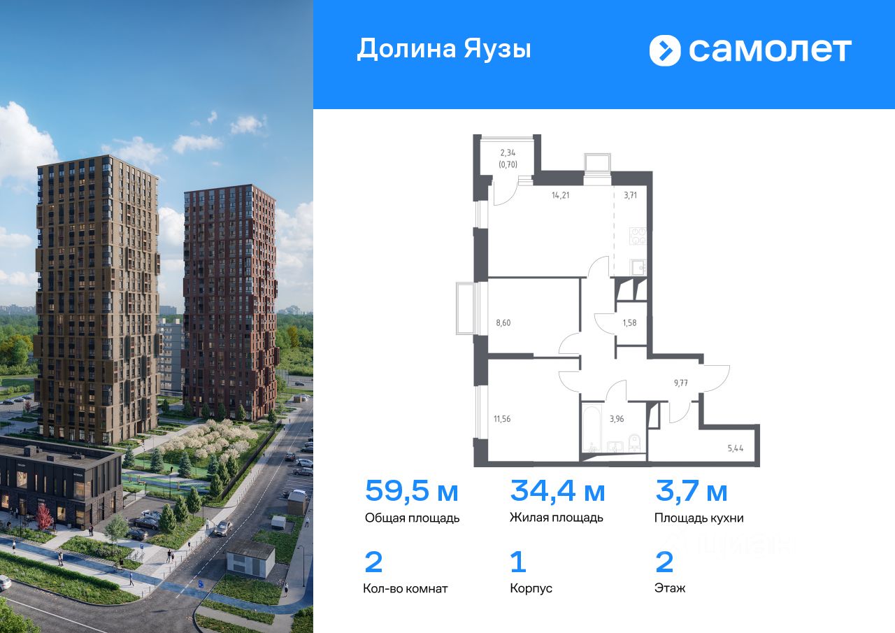 Предлагается 2-комнатная квартира комфорт-класса 59,53 кв.м в корпусе 1 на 2 этаже, в ЖК ''Долина Яузы'' Квартира с чистовой отделкой. Доступность дополнительных опций уточняйте у застройщика.