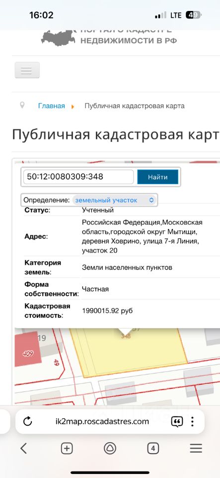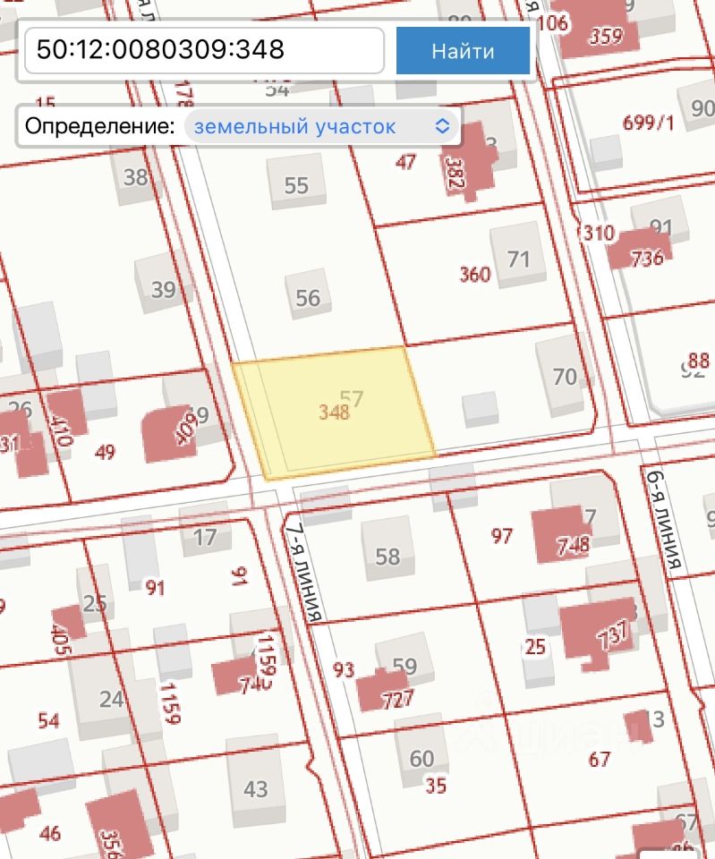 Площадь 6,12 соток, по факту 7,7 соток, кадастровый номер: 50:12:0080309:348.