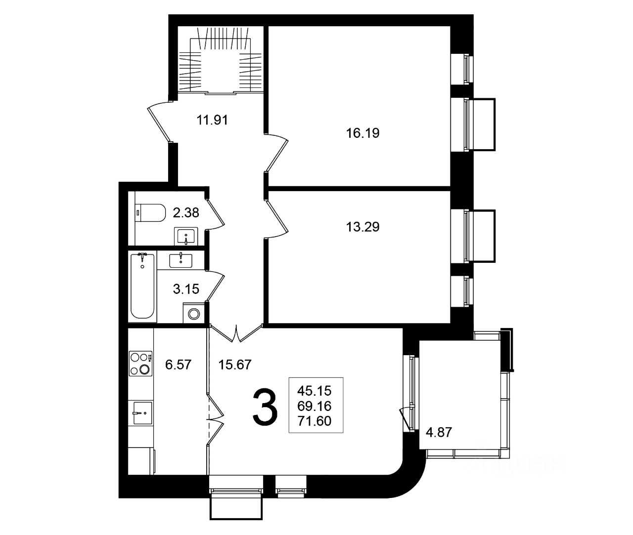 Продаётся 3-комнатная квартира в строящемся доме (Корпус 8), срок сдачи: 4-кв. 2025, общей площадью 71.60 кв.м., на 4 этаже.