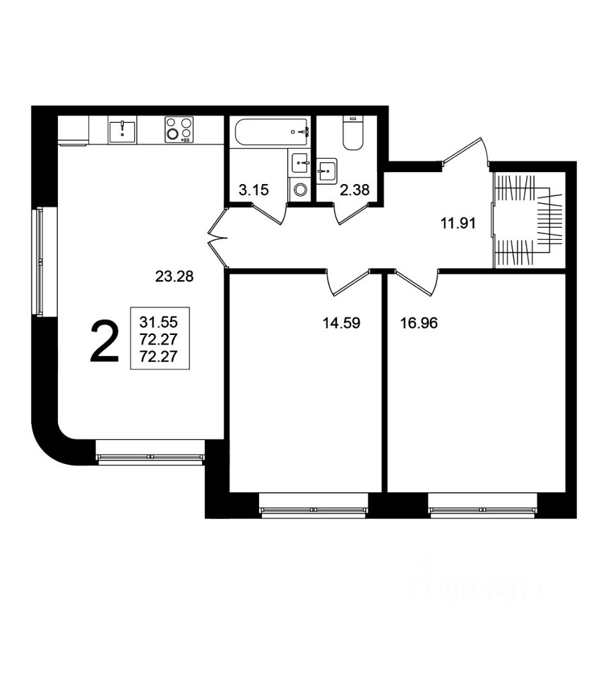 Продаётся 2-комнатная квартира в строящемся доме (Корпус 7), срок сдачи: 1-кв. 2026, общей площадью 72.27 кв.м., на 1 этаже.