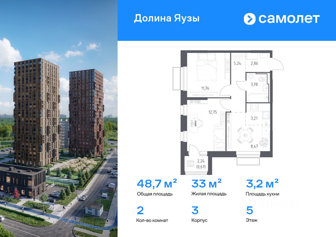 Предлагается 2-комнатная квартира комфорт-класса 48,74 кв.м в корпусе 3 на 5 этаже, в ЖК ''Долина Яузы'' Квартира с чистовой отделкой. Доступность дополнительных опций уточняйте у застройщика.