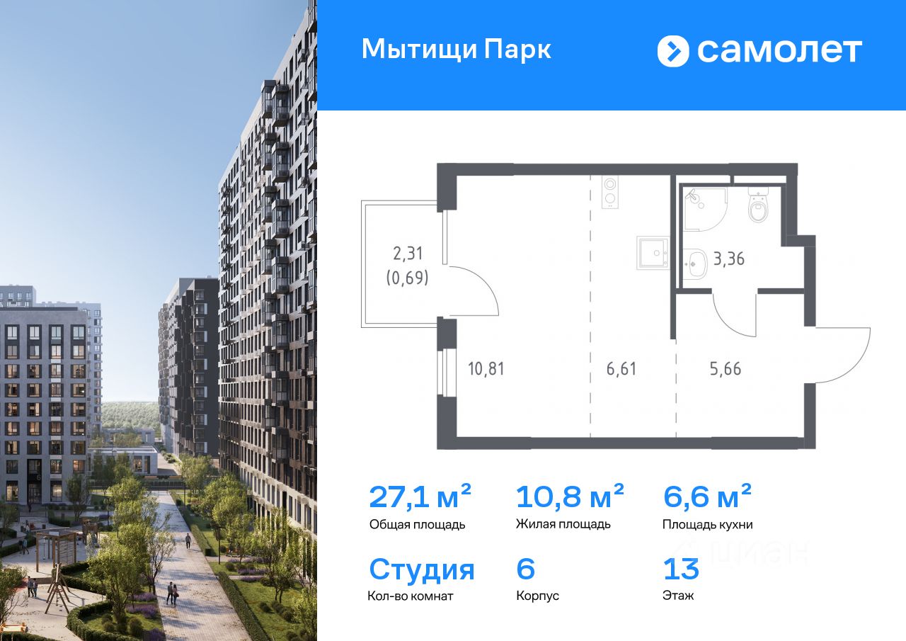 Строим кварталы для жизни с заботой о будущем. Предлагается квартира студия комфорт-класса 27,13 кв.м в корпусе 6 на 13 этаже, в ЖК ''Мытищи Парк'' Квартира без отделки. Доступность опции ''отделка'' и возможность комплектации мебелью и декором уточняйте у застройщика.