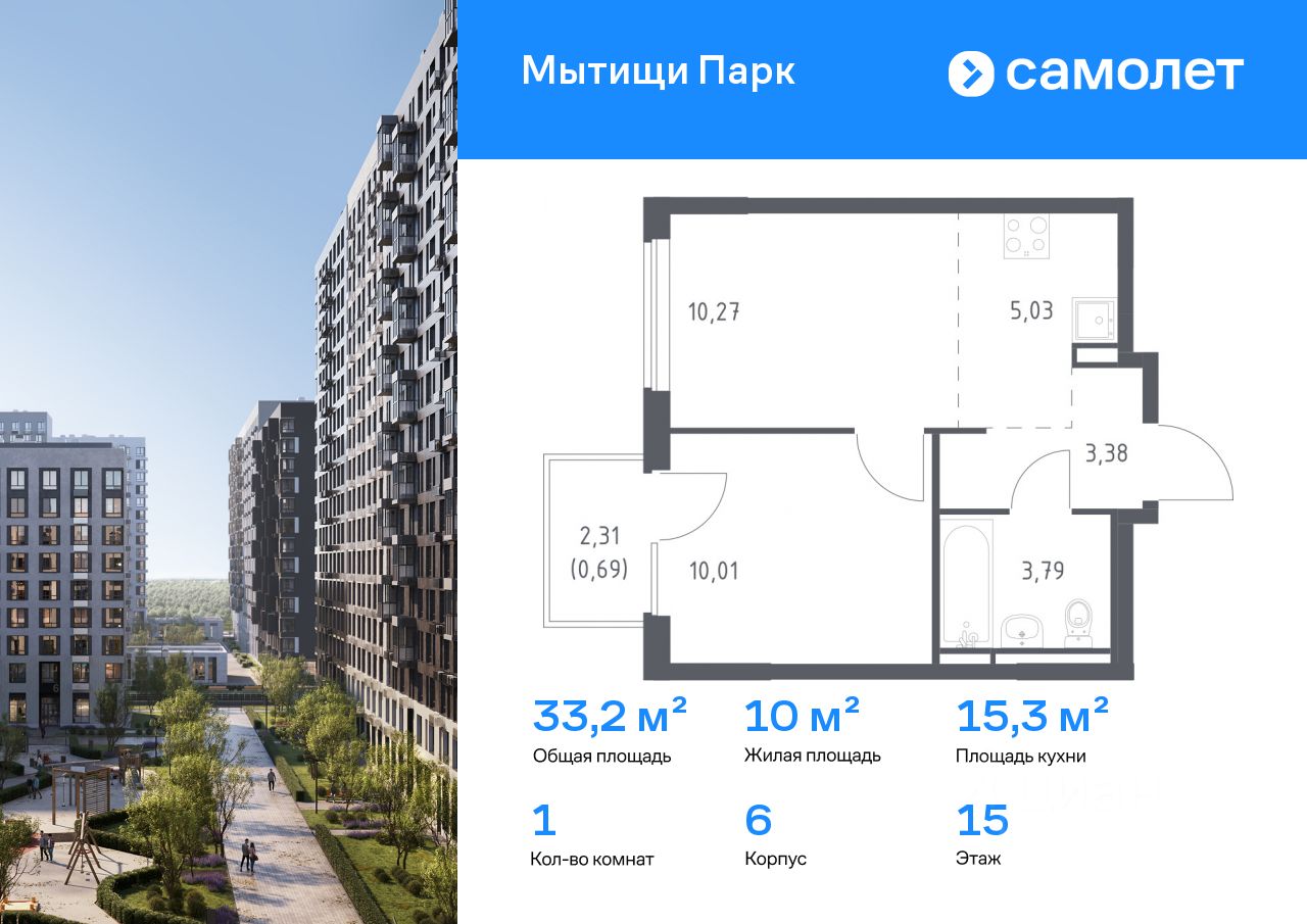 Предлагается 1-комнатная квартира комфорт-класса 33,17 кв.м в корпусе 6 на 15 этаже, в ЖК ''Мытищи Парк''