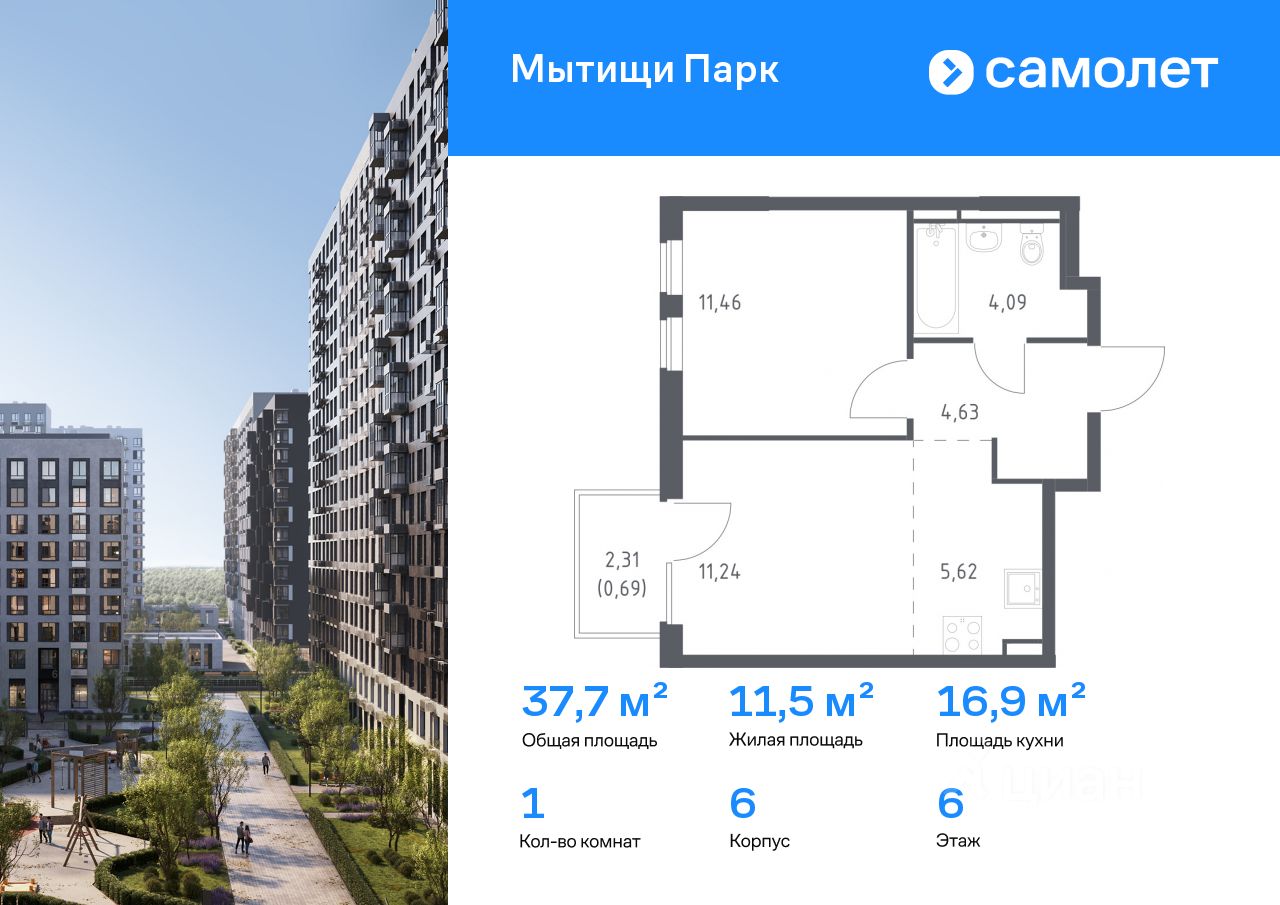 Предлагается 1-комнатная квартира комфорт-класса 37,73 кв.м в корпусе 6 на 6 этаже, в ЖК ''Мытищи Парк''
