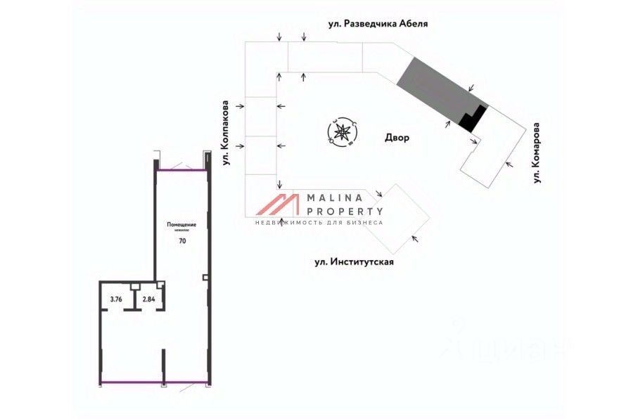 Помещение площадью 76,6 м2, располагается на 1 этаже, имеет открытую планировку, отдельный вход, витринное окно по фасаду. Парковка перед фасадом. Место для размещения рекламы.