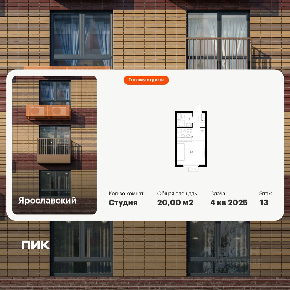 Продаётся квартира-студия площадью 20 кв.м на 13 этаже 25 этажного дома (Корпус 16.3, Секция 3) проекта ПИК Ярославский. Светлый просторный подъезд на уровне земли, функциональная планировка, большие окна, c отделкой.