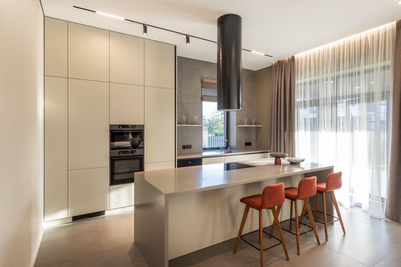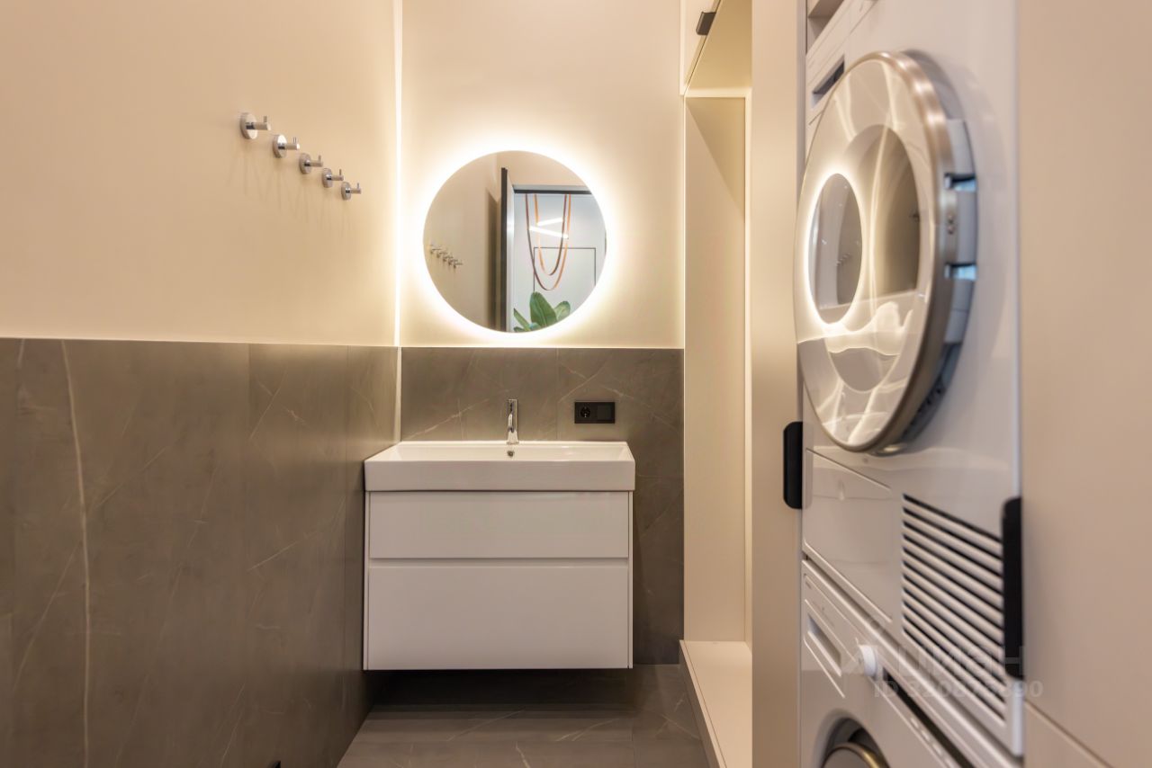 ПОЭТАЖНОЕ ОПИСАНИЕ: 1-ый уровень: гостиная-кухня-столовая, кабинет или гостевая спальня, с/у, прихожая и гардеробная, постирочный блок, подлестничное пространство - как зона хранения, просторная терраса.