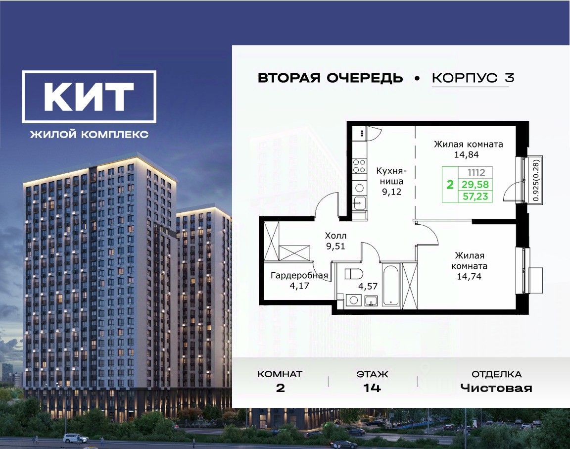 Продаётся 2-к квартира 57.23 кв.м. с чистовой отделкой в ЖК ''КИТ2'' на 14-м этаже 25 этажного дома.Жилой комплекс ''Кит 2'' спроектирован в урбанистической концепции ''Город в Городе''. Объект бизнес-класса предлагает рациональный подход к набору опций, необходимых для гармоничной жизни. Проект представляет собой два корпуса, которые образуют единую приватную территорию. Ее доминантой является двор с красивым ландшафтным дизайном и различными зонами, ориентированными на интересы жителей разного возраста. При создании пространства в приоритет ставился комфорт жителей. В шаговой доступности находятся: торговый центр, рестораны, кинотеатры, спортивный зал, образовательные учреждения и множество других объектов в сфере услуг.