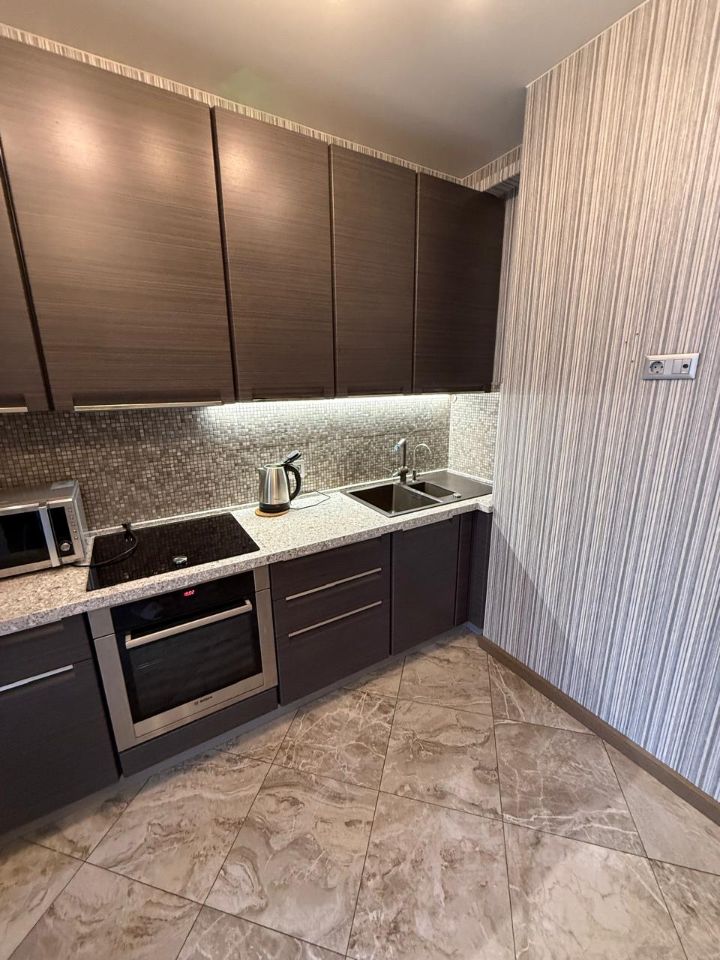 В квартире сделан качественный евроремонт. В комнате и на кухне есть необходимая мебель, а также вся нужная техника: холодильник, духовой шкаф, варочная панель, телевизор и стиральная машина. Окна выходят во двор, что обеспечивает тишину и уют. В квартире есть большая гардеробная для хранения ваших вещей. Лоджия придаёт дополнительное пространство для отдыха.